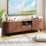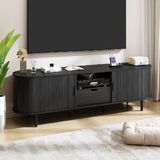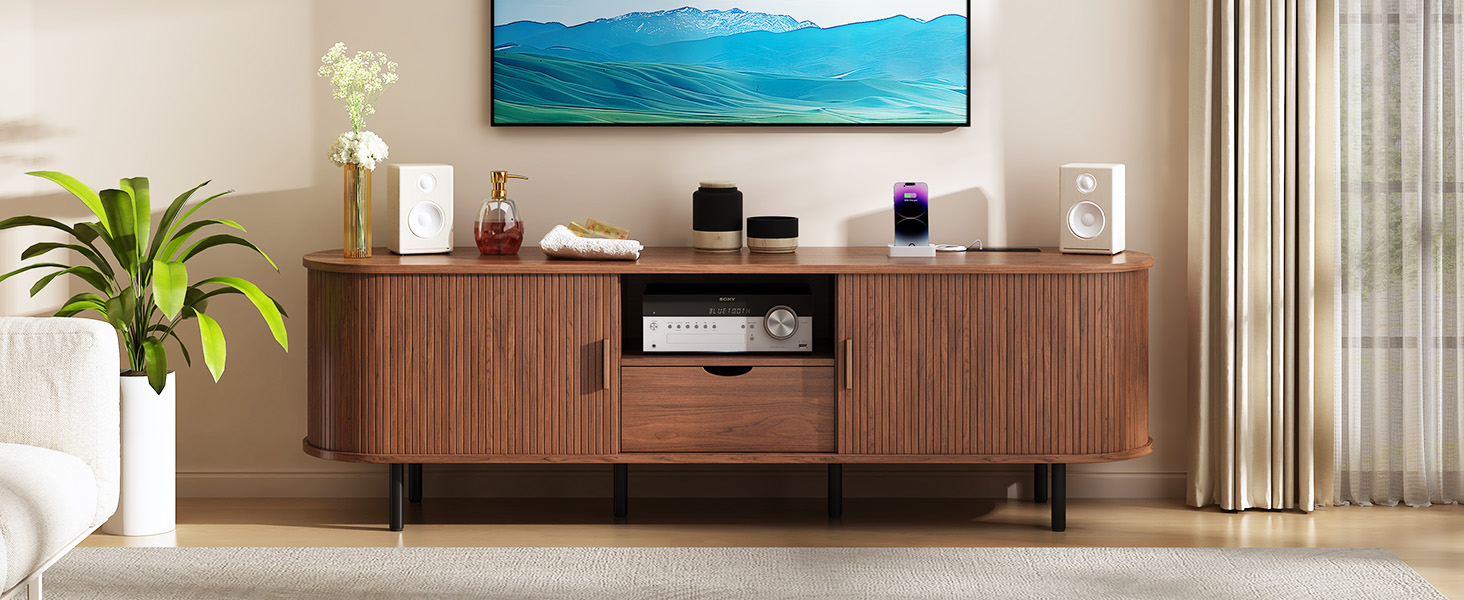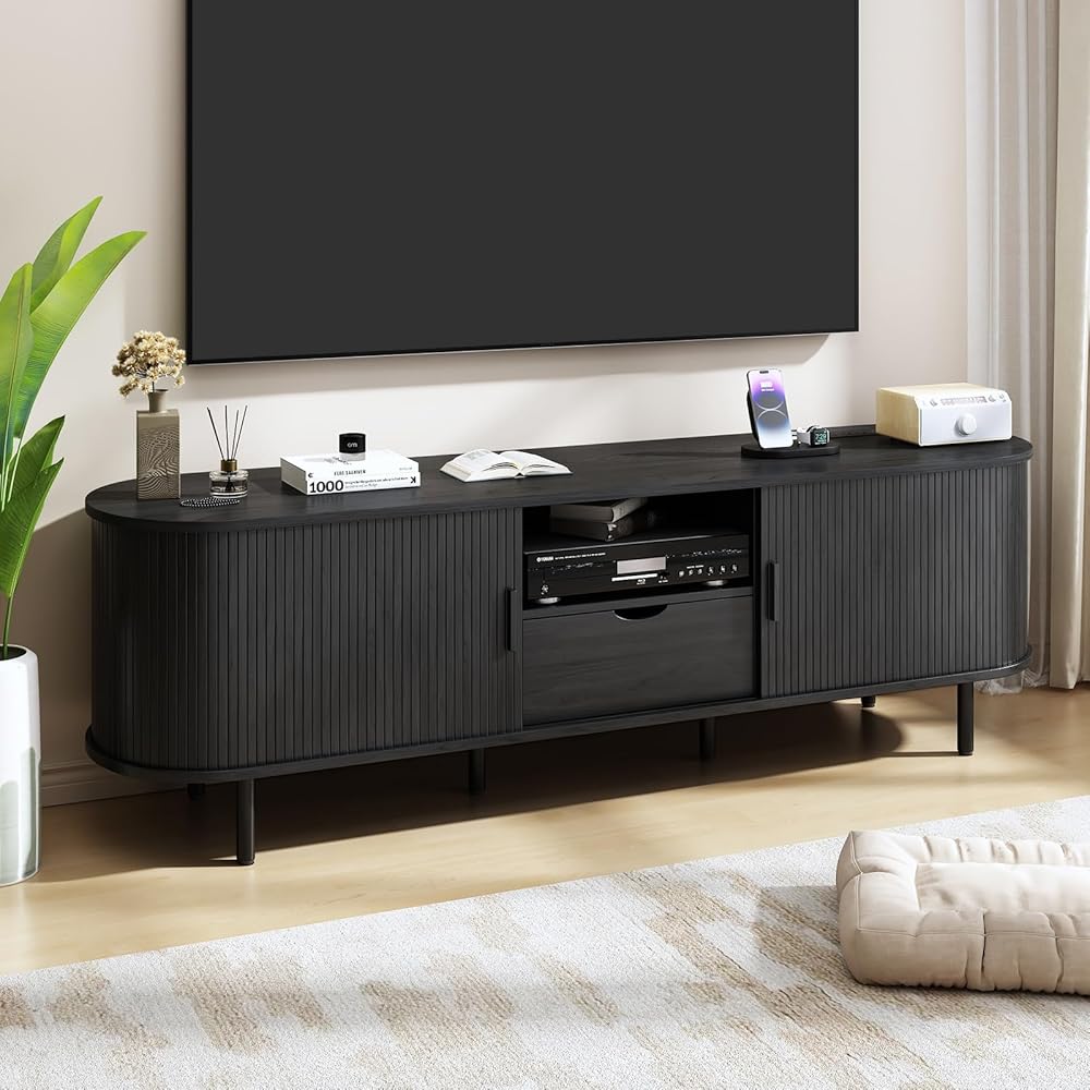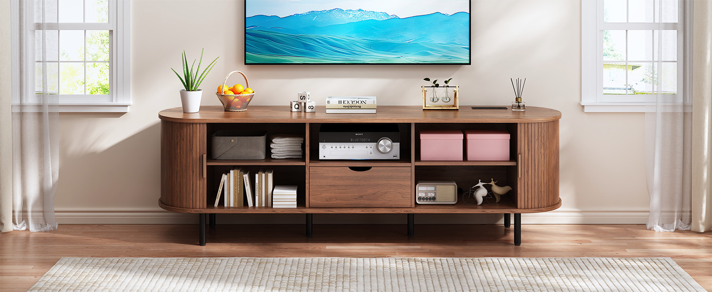 تصميم باب تامبور بيضاوي ومخدد أنيق: يتميز حامل تلفزيون Lefurture (مركز ترفيهي متعدد الاستخدامات) بمظهر بيضاوي أنيق وأبواب تامبور مخددة منزلقة سلسة، مع منافذ طاقة مدمجة لأجهزة التلفاز ومكبرات الصوت والأجهزة. يناسب حامل التلفزيون المخدد هذا أجهزة تلفزيون مقاس 45-80 بوصة، مما يضيف طرازًا أنيقًا وسهل الشحن إلى غرفة المعيشة أو غرفة النوم الخاصة بك