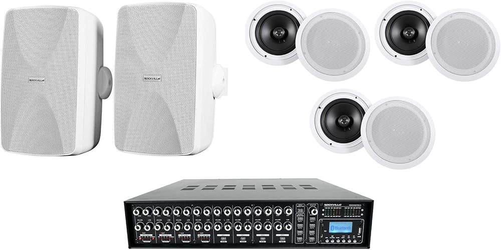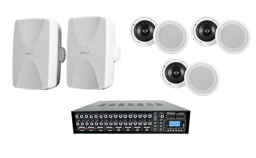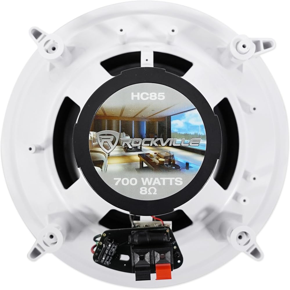 حزمة Rockville Rock Matrix 4: مضخم صوت تجاري 4 مناطق 70 فولت مع توجيه المصدر، (6) HC85 8 بوصة 700 واط ذروة/240 واط RMS لكل زوج من مكبرات الصوت في السقف، (2) WET-7020W 5.25 بوصة 70 فولت مكبرات صوت حائط بيضاء، 9 عناصر