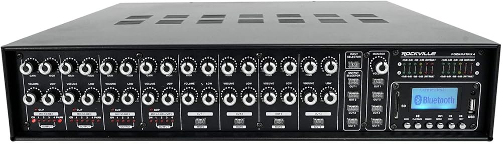 • التحكم في مصفوفة 4 مناطق باستخدام ROCK MATRIX 4: قم بتعيين مصادر Bluetooth أو USB/SD أو RCA أو الميكروفون لأي منطقة بشكل مستقل وتعيين مستويات لكل منطقة لغرف الطعام أو الباحات أو الردهات أو الممرات. ميكروفون 1 ذو أولوية للموسيقى للإعلانات، بينما يتيح لك الصوت الجهير/الصوت الثلاثي في ​​اللوحة الأمامية الضبط الدقيق بسرعة. يساعدك مكبر صوت الشاشة المدمج بقدرة 1 واط على تجربة أداء أي منطقة أثناء التنقل.