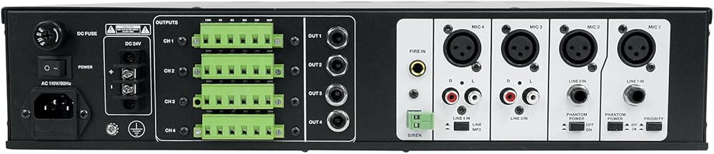 • الطاقة التجارية والمخرجات والحماية: توفير 110 واط RMS لكل منطقة (إجمالي 440 واط) مع أطراف توصيل لمكبرات الصوت 70 فولت/100 فولت أو 16 أوم/8 أوم/4 أوم. متطلبات الطاقة: 120 فولت تيار متردد / 50-60 هرتز أو DC24V. تضيف مخارج خطوط TRS مقاس 1/4 بوصة لكل منطقة أمبيرًا أو غواصات. ويدعم المحدد ومؤشرات المقطع ومروحة التبريد التشغيل لمدة ساعة طويلة، بينما يدعم تجاوز Fire/Siren والنسخ الاحتياطي DC 24V تكامل السلامة.