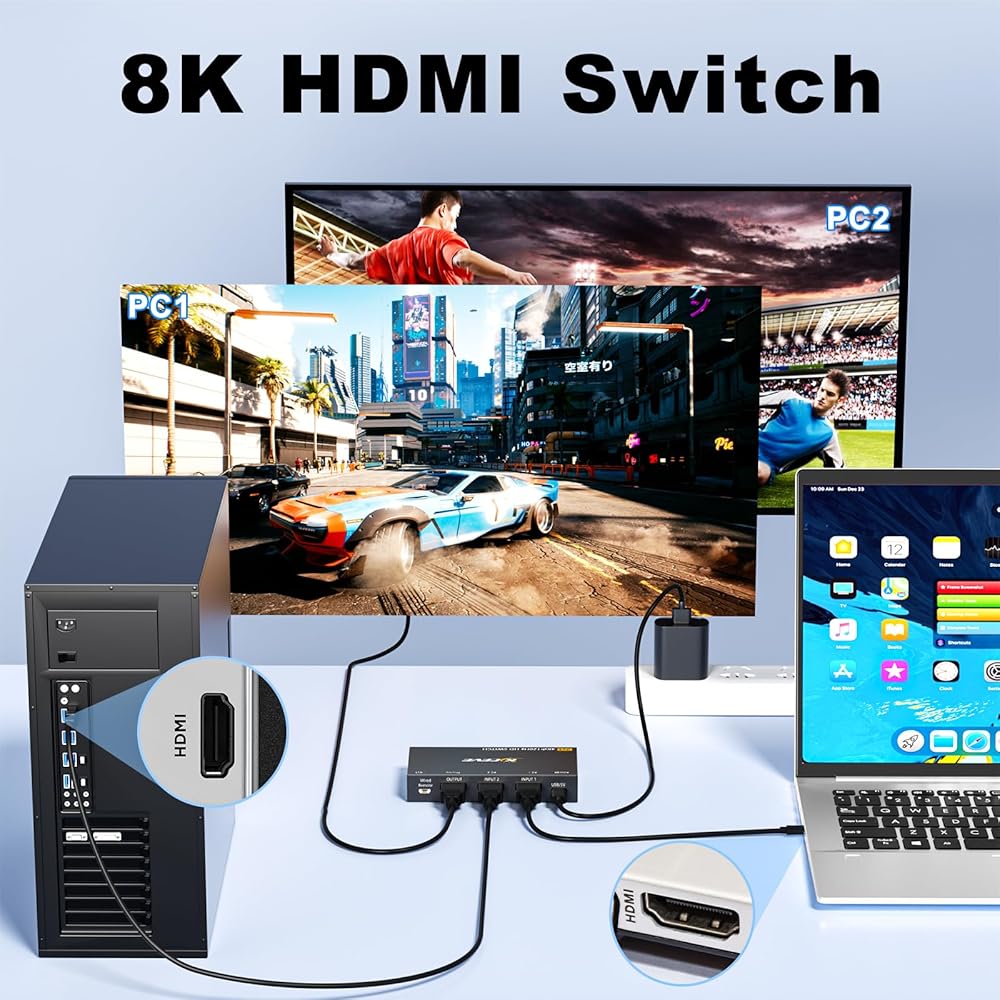 This HDMI switch is plug and play, no need to install software or drivers. Two switching methods are provided: 1. Just press the select button on the machine to switch the signal source; 2. Using the wired extension button, you can place the switcher outside the working area to make your desktop more tidy. NOTE: Keyboard shortcuts (hotkeys) toggles are not supported.