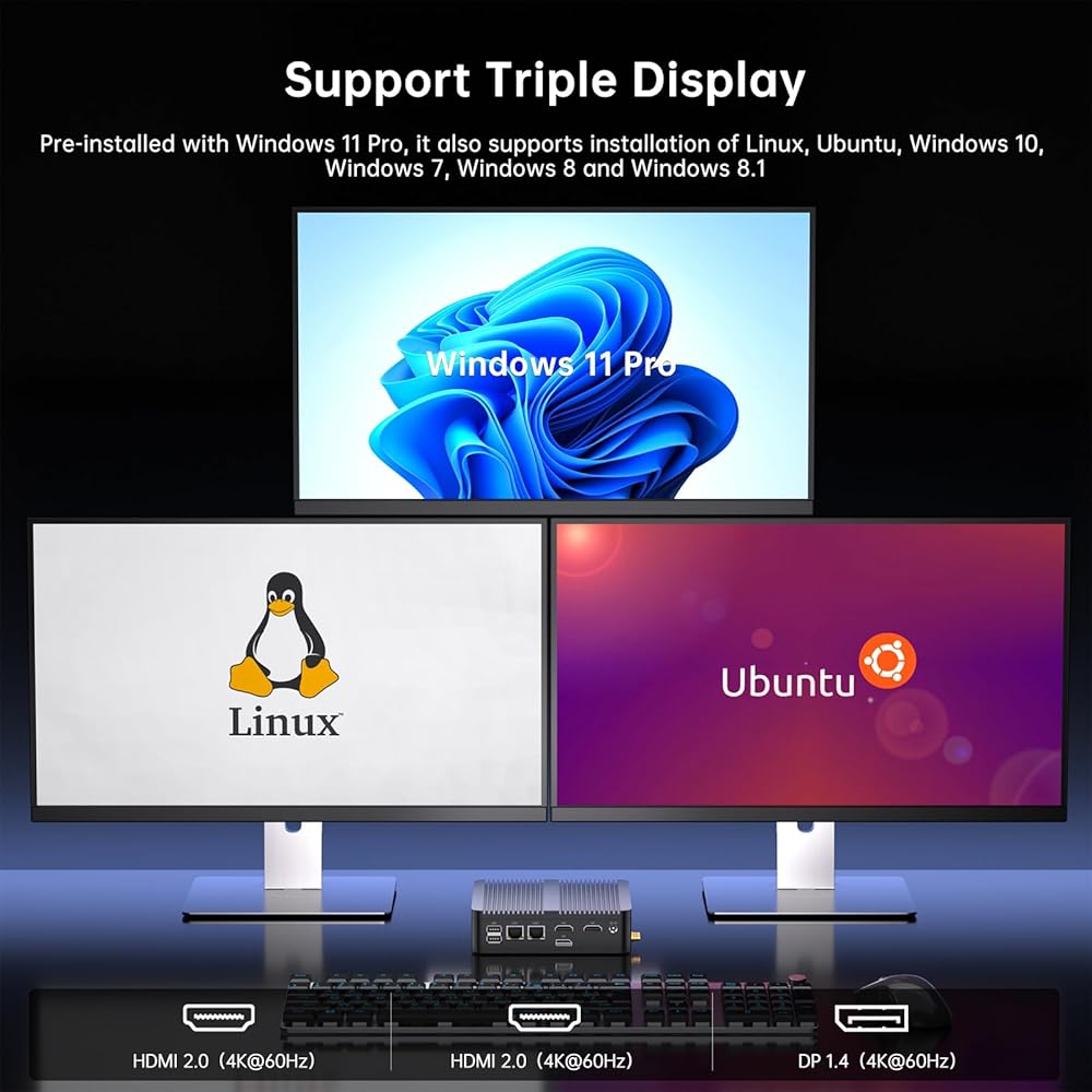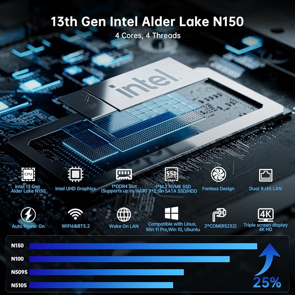 Thdeukoty Industrial Mini PC N150 (يصل إلى 3.6 جيجا هرتز)، نظام Win 11 Pro المثبت مسبقًا، 16 جيجا DDR4 RAM 256 جيجا Pcie M.2 SSD، WIFI6/BT5.2/USB3.0/RJ45/COM Ports/VESA، كمبيوتر بدون مروحة
