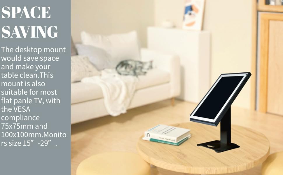 سيوفر حامل سطح المكتب المساحة ويجعل طاولتك نظيفة. هذا الحامل مناسب أيضًا لمعظم أجهزة التلفاز المسطحة. مع التوافق مع معايير VESA 75 × 75 مم و100 × 100 مم. حجم الشاشات 13 بوصة - 32 بوصة.