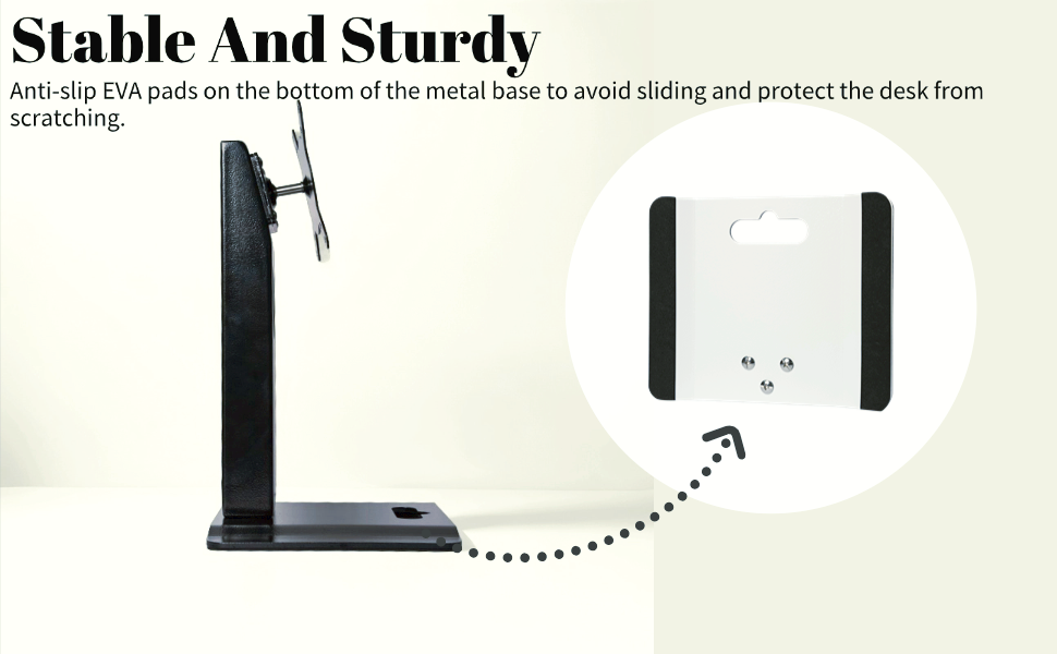 حامل سطح المكتب مصنوع من صفائح معدنية شديدة التحمل مع معالجة سطحية. يضمن البناء القوي الثبات والمتانة. وسائد EVA مضادة للانزلاق في الجزء السفلي من القاعدة المعدنية لتجنب الانزلاق وحماية المكتب من الخدش.