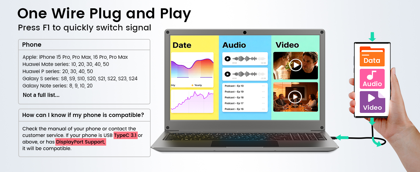 توافق عالمي مع كابل واحد: يتميز بمنفذ Type-C كامل المواصفات لسهولة التوصيل والتشغيل الحقيقية. يقوم كابل واحد بتوصيل الطاقة والشاشة والبيانات. مثالي لأجهزة Samsung DeX، وRaspberry Pi، وأجهزة الكمبيوتر الصغيرة، وأجهزة الألعاب المحمولة (Steam Deck/ROG Ally)، وNintendo Switch، والمزيد.