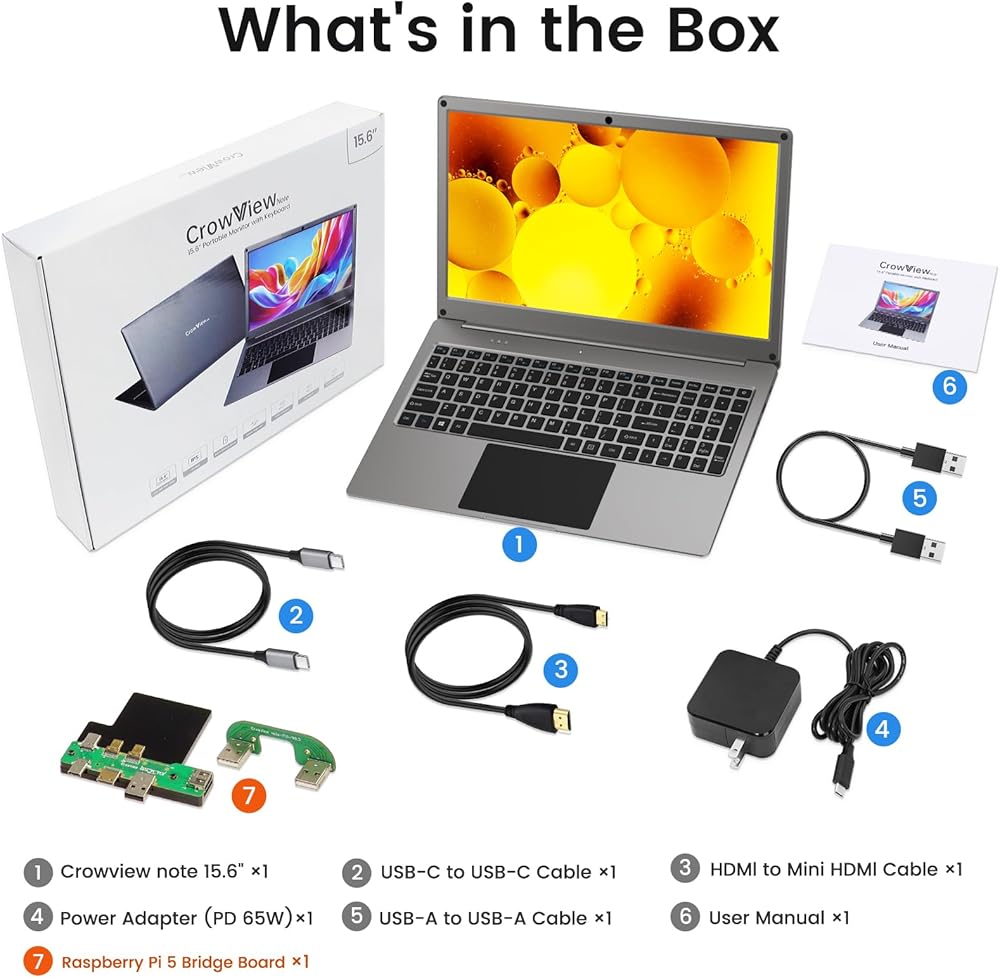 مجموعة كاملة جاهزة للاستخدام: احصل على كل ما تحتاجه في صندوق واحد: جهاز CrowView Note Lapdock، ومحول PD من النوع C بقدرة 65 وات، وكابل USB-C كامل المواصفات، وكابل Mini HDMI إلى HDMI، وكابل USB-A، ولوحة جسر Raspberry Pi 5، ودليل المستخدم. ابدأ العمل أو اللعب خلال دقائق. (ملاحظة: CrowView Note عبارة عن محطة عرض ولا تحتوي على وحدة المعالجة المركزية أو ذاكرة الوصول العشوائي أو وحدة تخزين داخلية. فهي تتطلب جهازًا مضيفًا متصلاً لتعمل.)