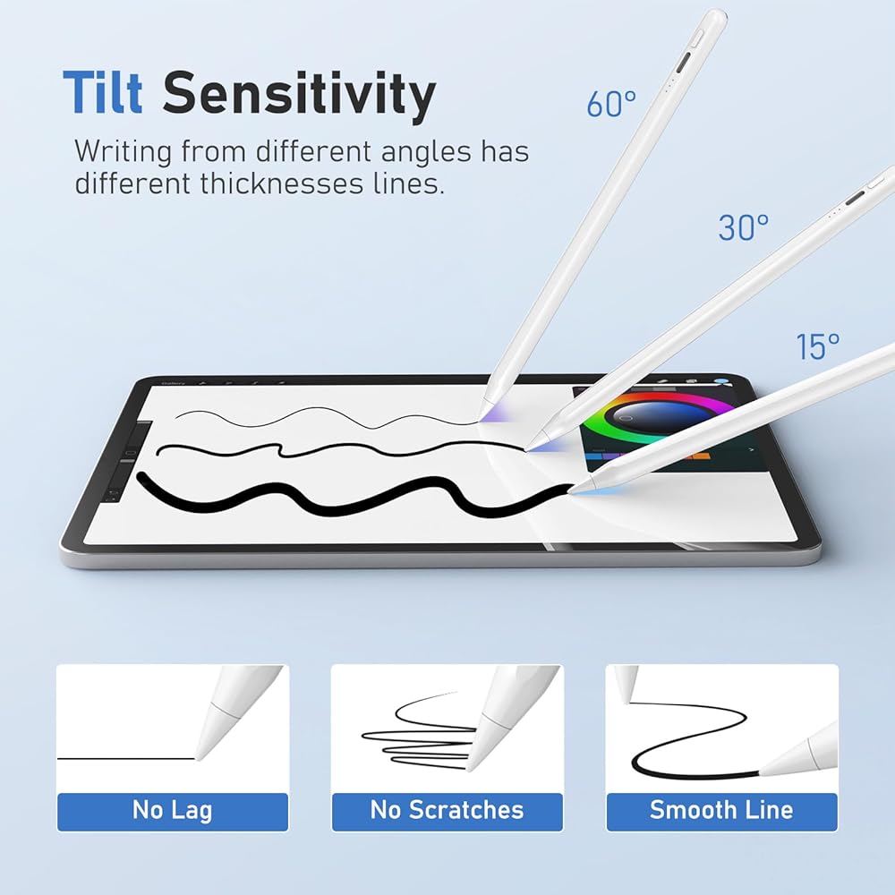 حساسية الإمالة: يوفر قلم iPad هذا تجربة طبيعية وسلسة، ويجمع بين الدقة المثالية للبكسل مع زمن الاستجابة المنخفض الرائد في الصناعة. تسمح حساسية الإمالة بالرسم وتدوين الملاحظات وما إلى ذلك بسهولة، مما يحاكي ملمس قلم الرصاص التقليدي. يتضمن 5 رؤوس Apple Pencil قابلة للاستبدال لإطالة عمر القلم. من المهم ملاحظة: لا يوجد حساسية للضغط