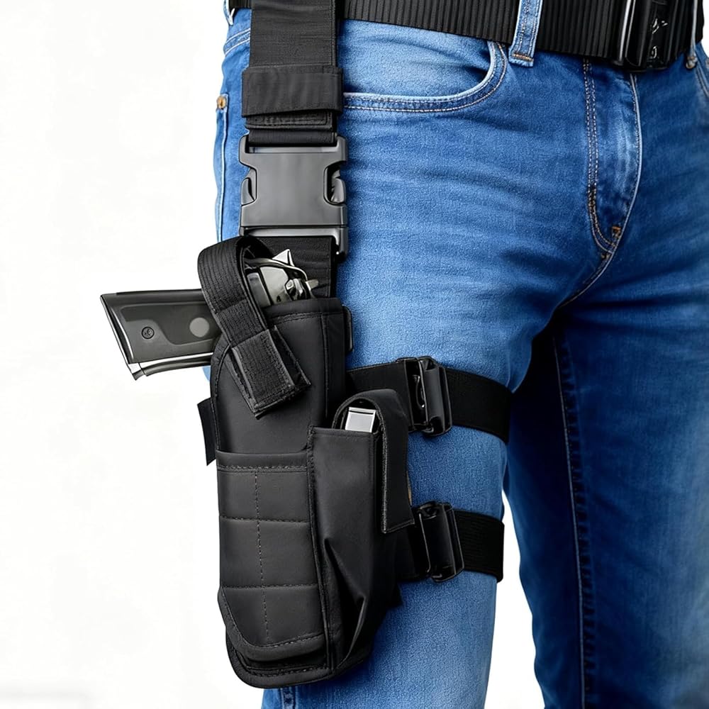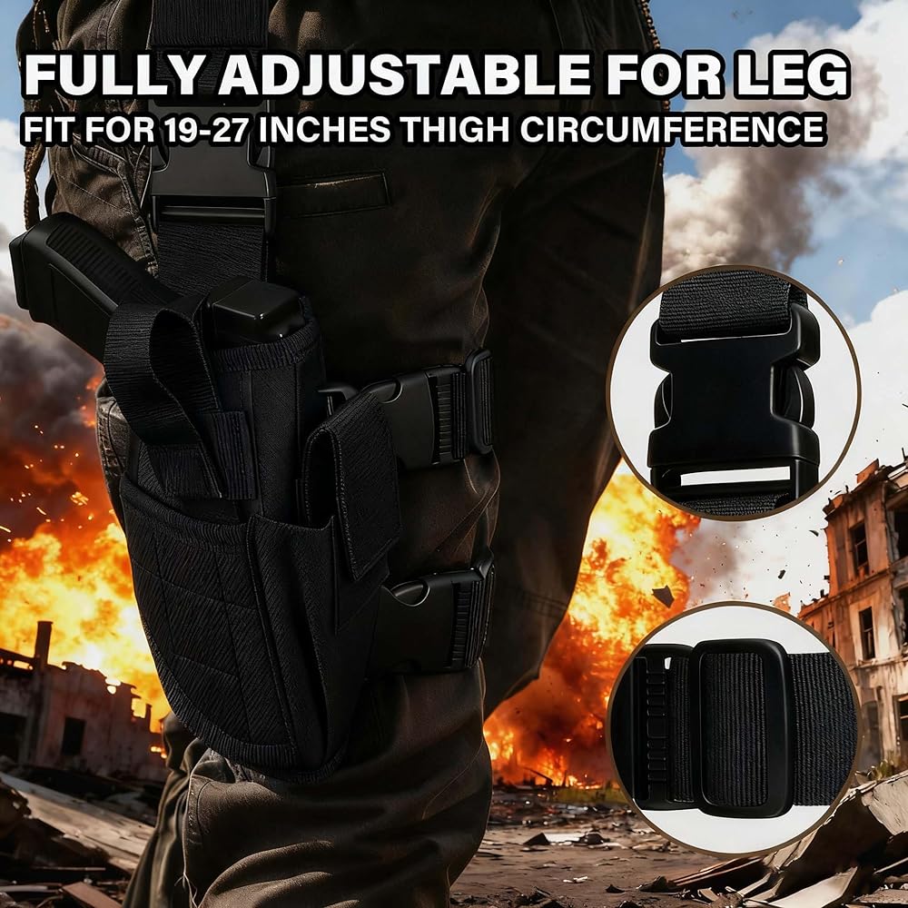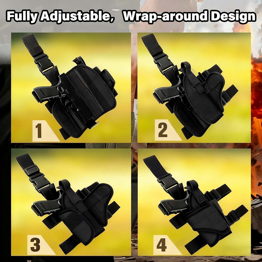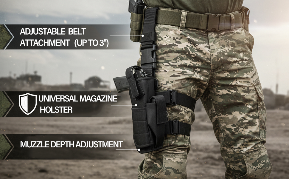 راحة كاملة وقابلية للتعديل: مصنوعة من مادة النايلون الممتازة، حافظة مسدس الساق الخاصة بنا مريحة وخفيفة الوزن ولكنها متينة للغاية. كل شيء بدءًا من أحزمة الساق، وحتى حزام الاحتفاظ بالسلاح الناري، وحزام الاحتفاظ بالمجلة الإضافي، والركوب على الحافظة، وارتفاع الكمامة يمكن تعديلها جميعًا وفقًا لتفضيلات مطلق النار ومطلق النار