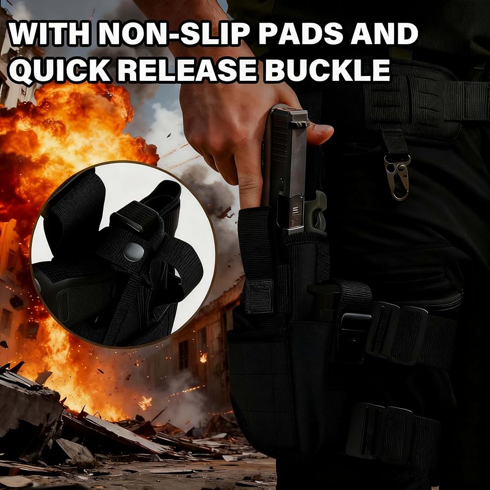 الأمان والثبات: يتميز هذا الجراب التكتيكي بإغلاق آمن بخطاف وحلقة، ويمكنه تأمين السلاح بشكل فعال ومنع طرده أثناء الحركة. أحزمة الساق وارتفاع الكمامة قابلة للتعديل