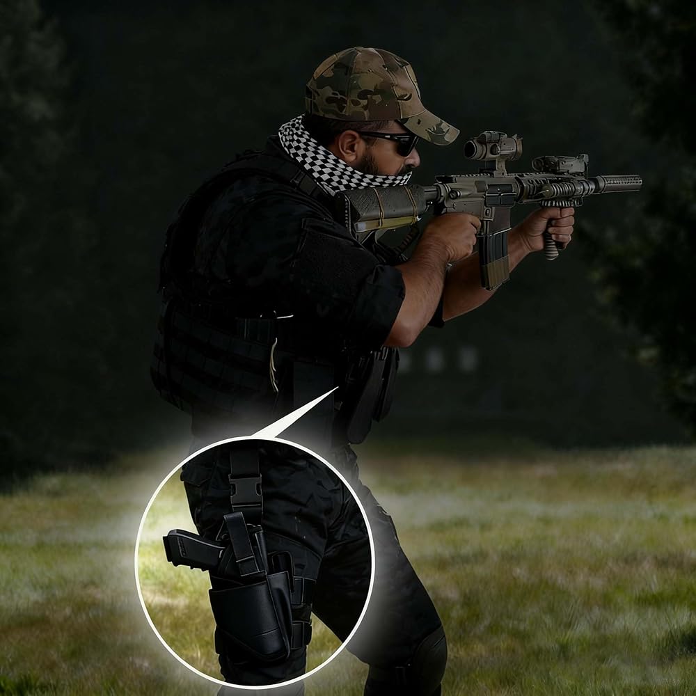 راحة السلامة: بينما تضمن أحزمة الفخذ المزدوجة القابلة للتعديل بالكامل والظهر غير القابل للانزلاق بقاء سلاحك آمنًا على ساقك. مثالية للمشغلين أو الرجال في الهواء الطلق الذين يرغبون في حمل سلاح جانبي بشكل مريح. قم بالزحف والجري والقفز والتسلق والتحرك بحرية دون القلق بشأن سقوط الأسلحة