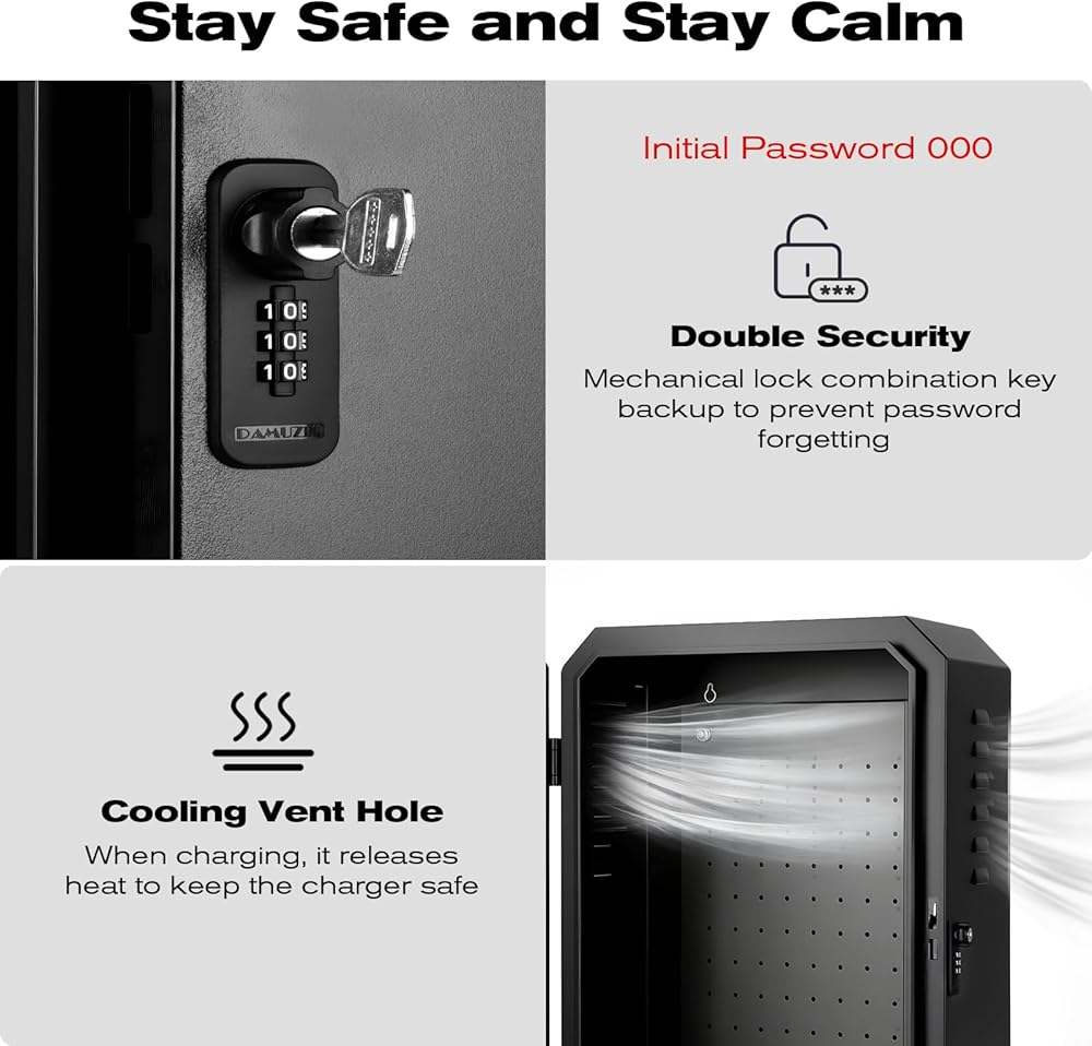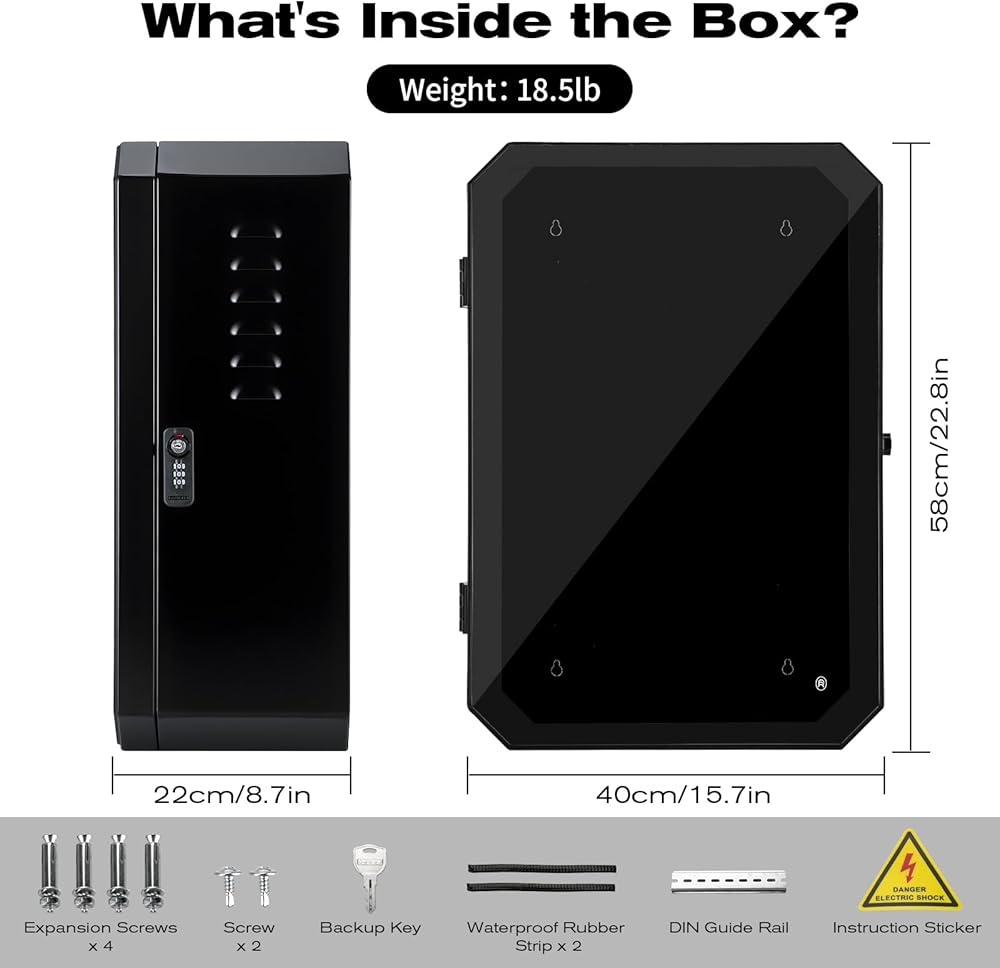【تركيب وتهوية سهلة ومتعددة الاستخدامات】 تأتي كاملة مع جميع أدوات التثبيت الضرورية والثقوب المثقوبة مسبقًا للتركيب المباشر على الحائط في المرآب أو الممرات أو مواقف السيارات. تعمل فتحات التهوية الموضوعة بشكل استراتيجي في الأسفل على تعزيز تبديد الحرارة بشكل فعال، مما يضمن عمل الشاحن الخاص بك بأمان وكفاءة داخل الصندوق.