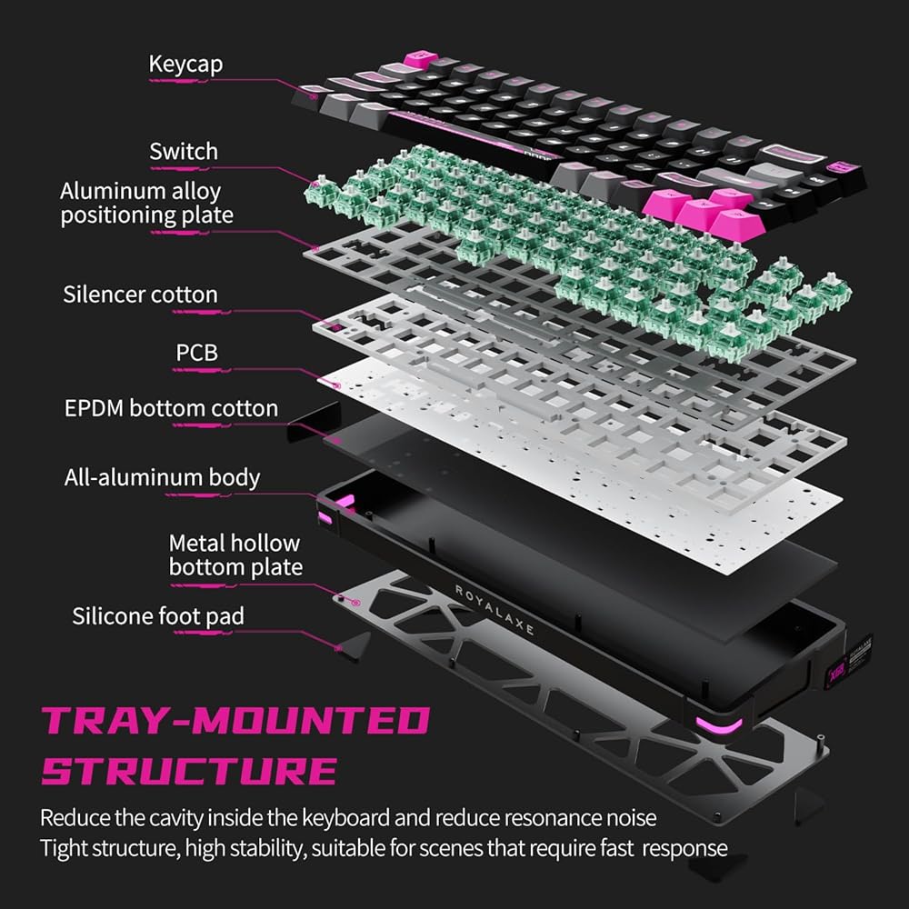 【هيكل مثبت على صينية الرياضات الإلكترونية】يمكن للهيكل المثبت على الدرج الذي يستخدمه ROYALAXE X68 أن يتحمل كل نقرة بشكل ثابت، ويقلل من التجويف الداخلي للوحة المفاتيح، ويقلل من ضوضاء الرنين، وله هيكل مدمج وثبات عالي، مما يجعله مناسبًا للسيناريوهات التي تتطلب استجابة سريعة.
