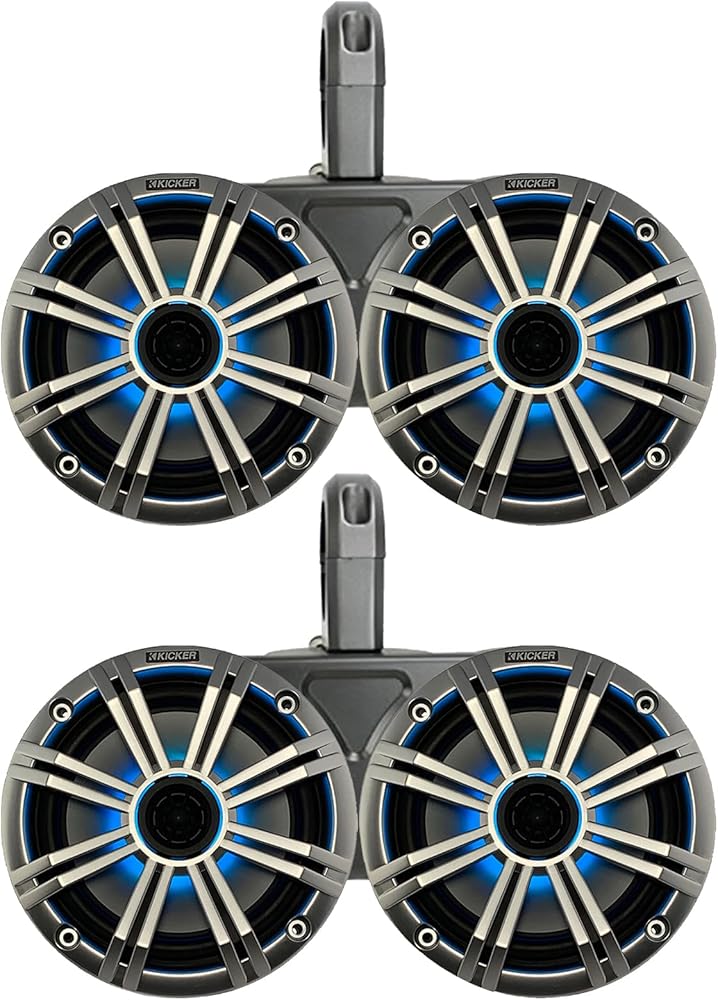 نظام برج واكيبورد مزدوج أسود من كيكر مع زوجين (الكمية 4) من الفضة 6.5 بوصة 195 وات ماكس باور مارين OEM بديل RGB متعدد الألوان LED مكبرات صوت قارب محورية