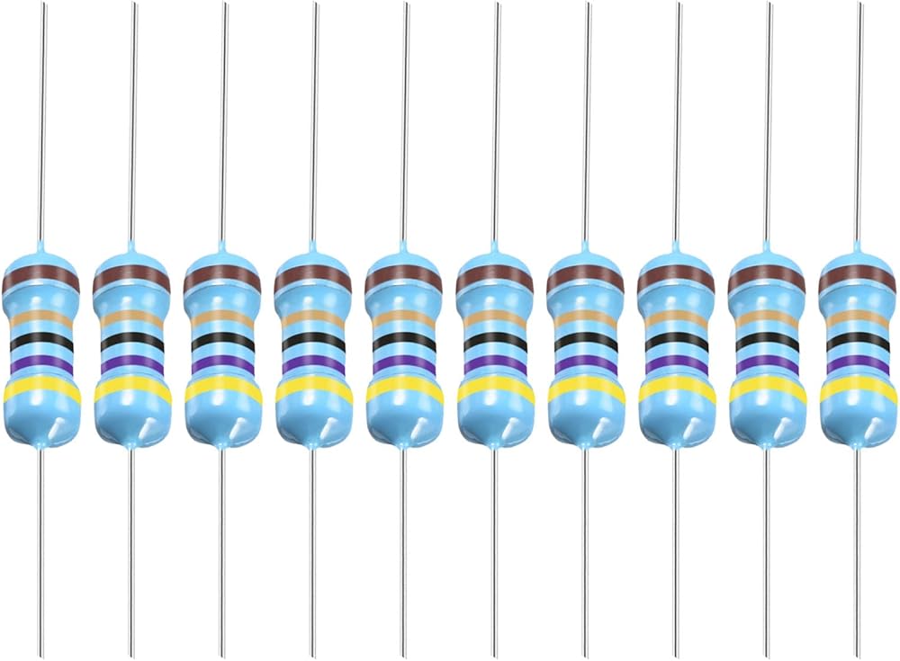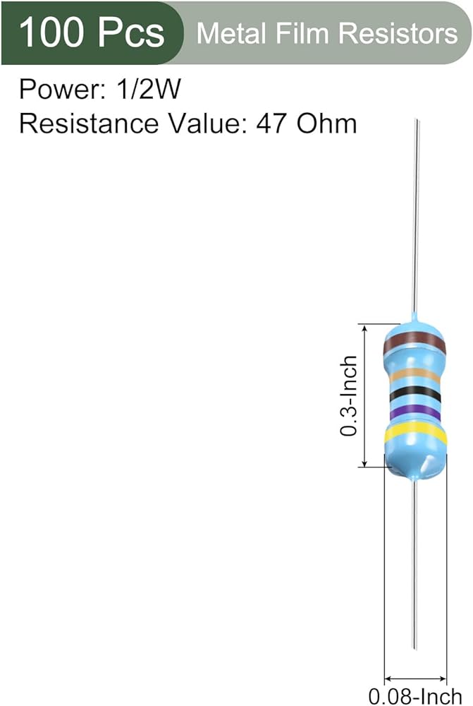 ما الذي تحصل عليه - تأتي العبوة مع 100 قطعة من مقاومة الأغشية المعدنية التي تقيس حجم الجسم: 8.5 × 3 مم / 0.3 × 0.08 بوصة (طول × عمق)؛ طول الجسم: 8.5 مم ± 0.5 مم؛ الطاقة: 1/2 واط؛ التسامح: 1%(F); المقاومة: 47 أوم؛ رمز اللون: الأصفر، الأرجواني، الأسود، الذهبي، البني.