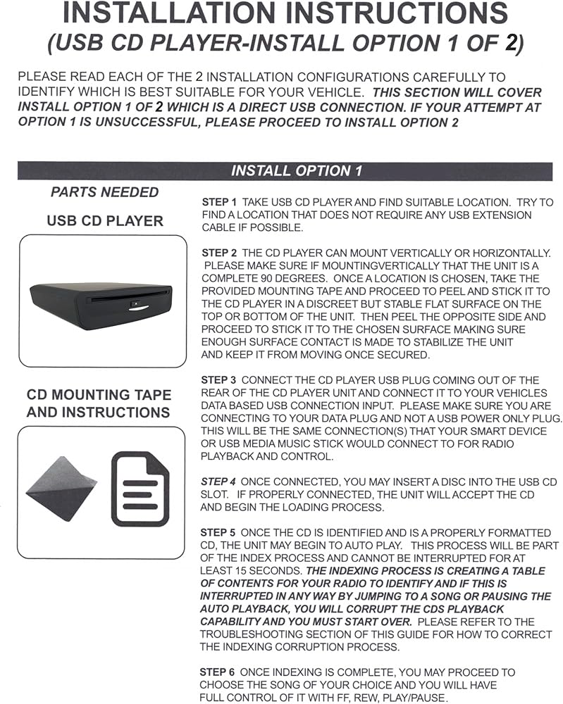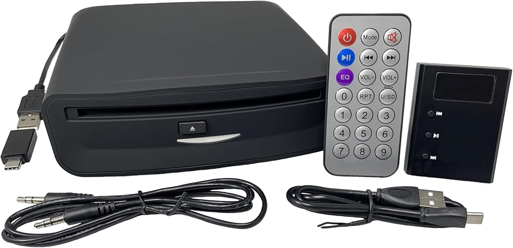 Enjoy the “DELUXE” Design and Performance of the (AIE) VN-CDUSB-DLX Vehicle CD Player System. The (AIE) VN-CDUSB-DLX Kit provides 2 Install/Connection Types: 1) Direct Connection – USB direct connection to Factory Radio. Full control with on-screen display of Track number and song length, amount played and remainder. Connects to USB port of vehicle for optimal sound quality. CD player controlled from included remote. 2) Built-In Audio Transmitter (w/Remote) – Audio transmitted to radio wirelessly with active display from included CD processor module and controlled from included remote. Key Feature Points: 1) USB CD PLAYER - Enjoy the “DELUXE” Design and Performance of the (AIE) VN-CDUSB-DLX Vehicle CD Player System. This is an Automotive grade CD player with Vertical and Horizontal mount capability. 2) CD REMOTE CONTROL – When direct factory interfacing is not an option, the provided Remote Control will operate ALL CD functions. 3) AUDIO/DATA PROCESSOR – Module is designed to process and control audio signal and provide both hardwired and digitally transmitted audio to ANY radio type. 4) USB-A to USB-C Adapter – Adapter to connect from standard USB-A cable from the CD Player to a USB-C connection in your car data port, if needed (For cars equipped with USB-C input). Kit Contents: USB CD Player, CD Remote Control, Audio/Data Processor, USB Connecting Cable, AUX Cable, USB-A to USB-C Adapter. Compatible Formats: WMA or WAV, but not MP3. CD Player Dimensions: 6.25 x 6.25 x 1.875 inches.