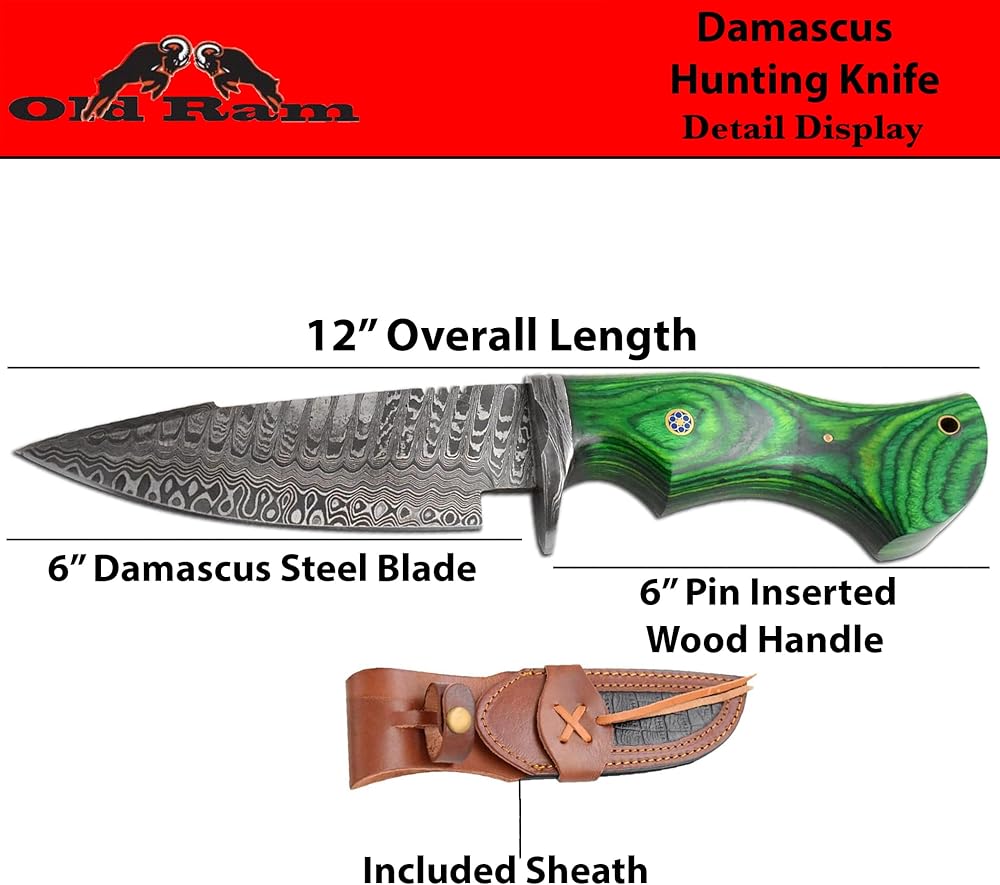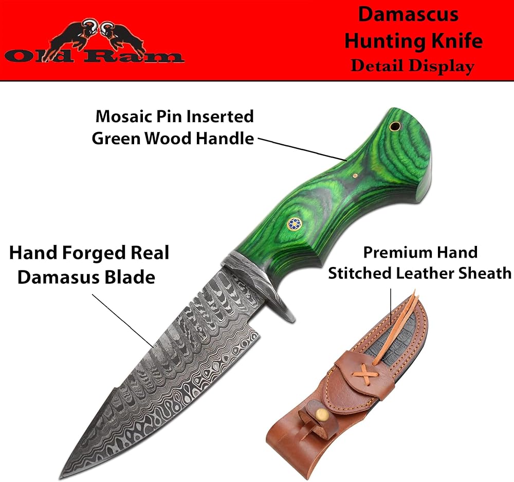 • Old Ram Handmade Real Damascus Steel Blade Hunting Knife.