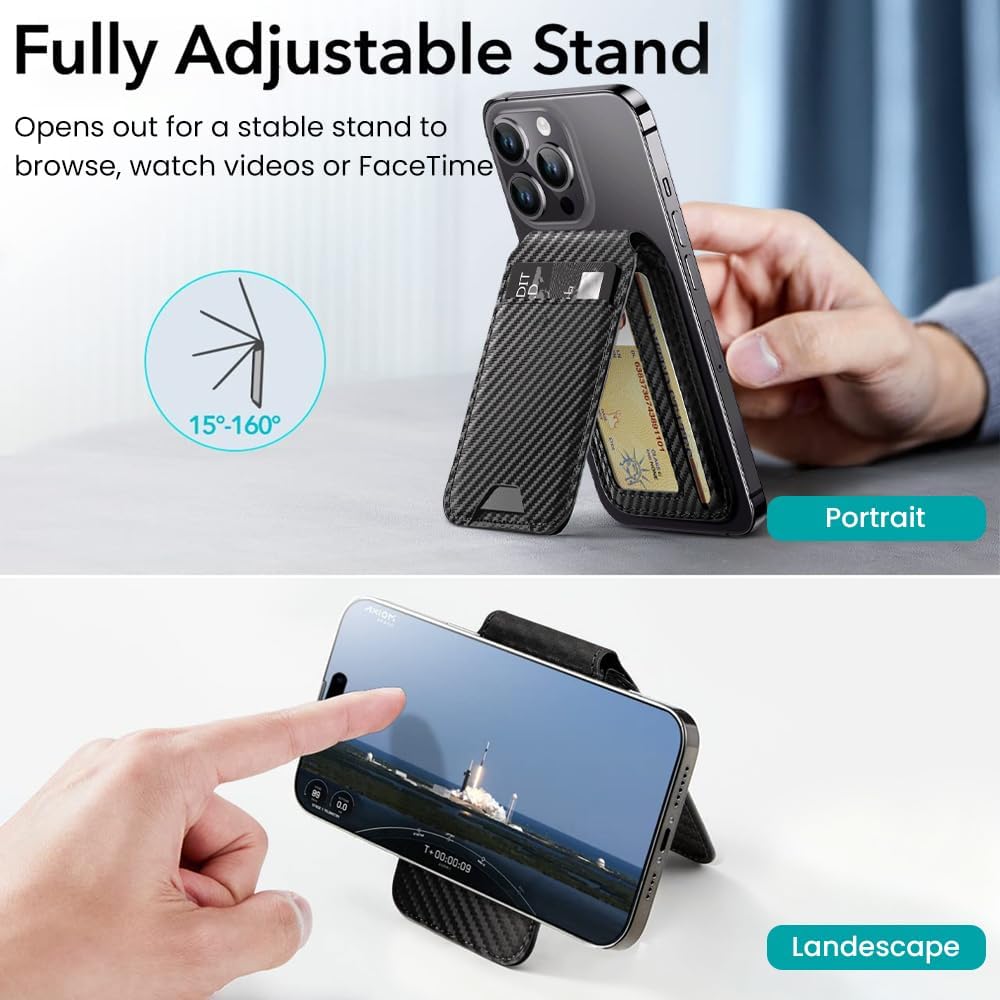 • 2-in-1 Function: Phone Wallet Magnetic + Adjustable Stand Holds, while its Magsafe Wallet Stand design frees your hands for videos, calls, and conferences. Dual horizontal/vertical viewing modes