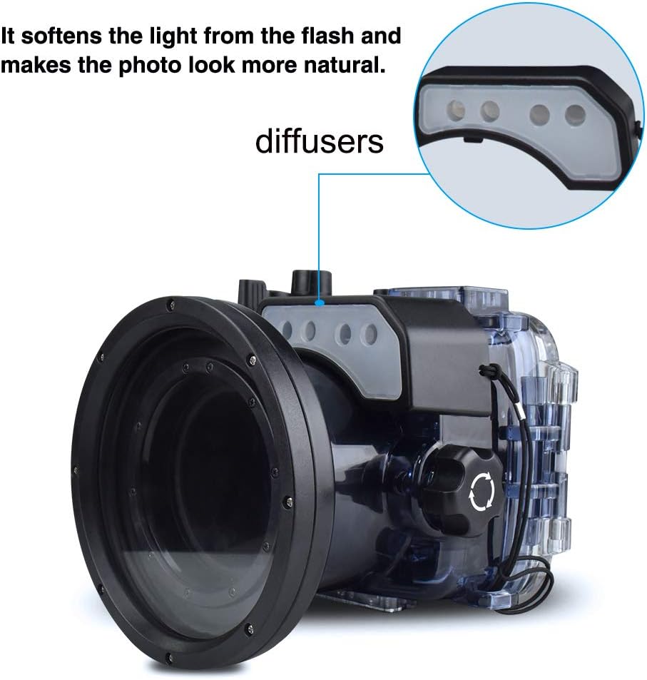 - عمق مقاوم للماء: غطاء كاميرا احترافي تحت الماء مُصنف لأعماق تصل إلى 60 مترًا/195 قدمًا، مثالي للغوص والسباحة والتصوير الفوتوغرافي للرياضات المائية
