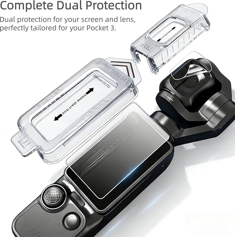 • ✅ Precision Cut & Easy Installation: Laser-cut to perfectly fit the Pocket 3's 2-inch rotatable screen and main camera lens. Includes detailed installation tools (alignment frame, dust stickers, cleaning cloth) for bubble-free, hassle-free application in seconds.