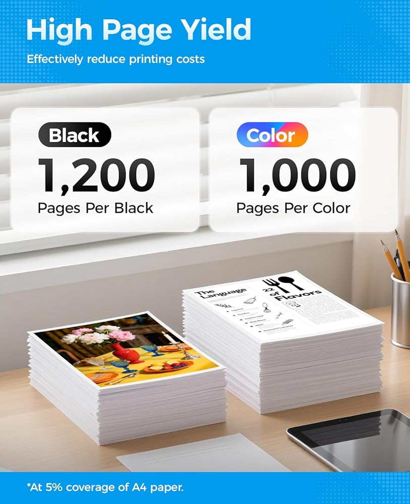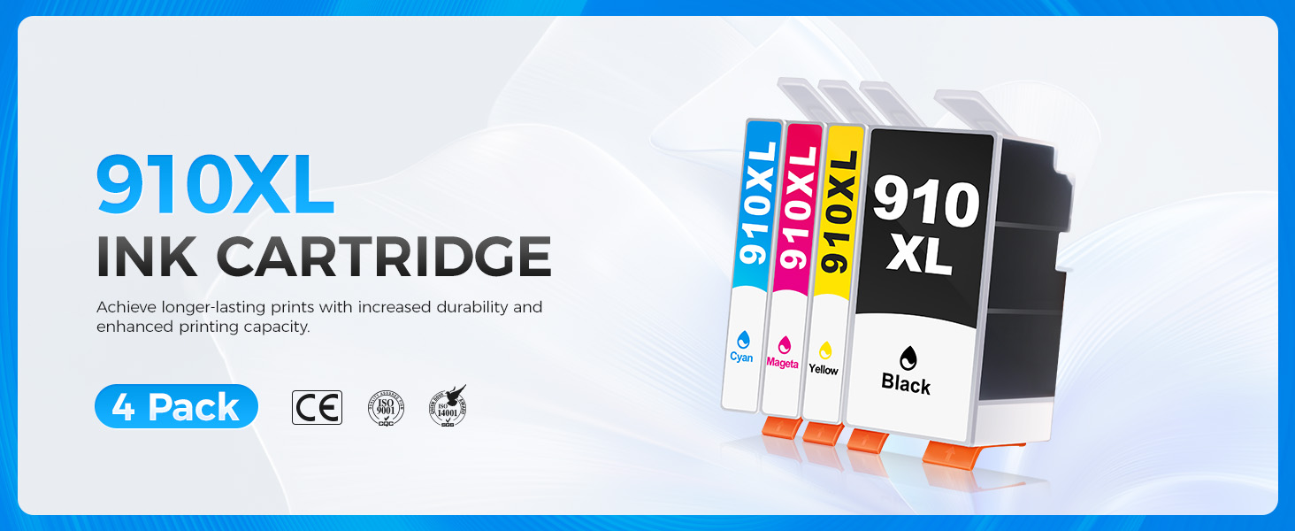 إخراج صفحة عالي الإنتاجية: طباعة 910XL باللون الأسود تصل إلى 1200 صفحة، وخراطيش ألوان 910XL تصل إلى 1000 صفحة لكل منها بتغطية 5%، مثالية للاستخدام في المكاتب المنزلية والشركات الصغيرة.