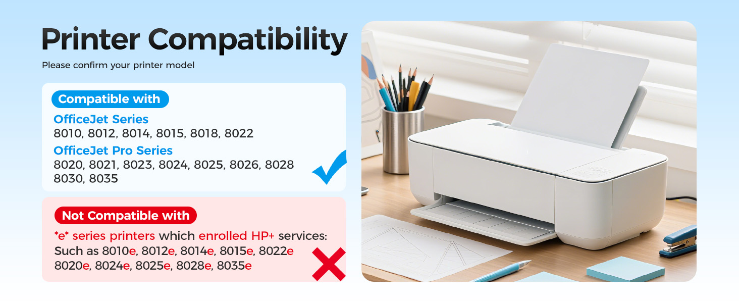 طابعات e-Series (غير HP+ فقط): متوافقة مع طابعات HP OfficeJet 8015e / 8022e / 8010e / 8012e / 8014e، وطابعات HP OfficeJet Pro 8025e / 8028e / 8035e / 8020e / 8024e - غير مسجلة في HP+ أو Instant Ink