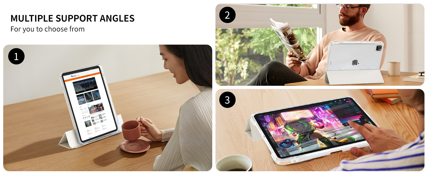 تصميم حامل منزلق قابل للإزالة: تتميز العلبة بحامل منزلق ثلاثي الطي قابل للفصل يمكنه ضبط الزاوية بسهولة لتلبية احتياجات المشاهدة الخاصة بك ويمكن إزالته للاستخدام المنفصل لتلبية متطلبات العرض والكتابة الخاصة بك. يعمل وضع الإدخال 30 درجة كحامل لوحة المفاتيح، بينما يعمل وضع الفيديو 65 درجة كحامل للشاشة.