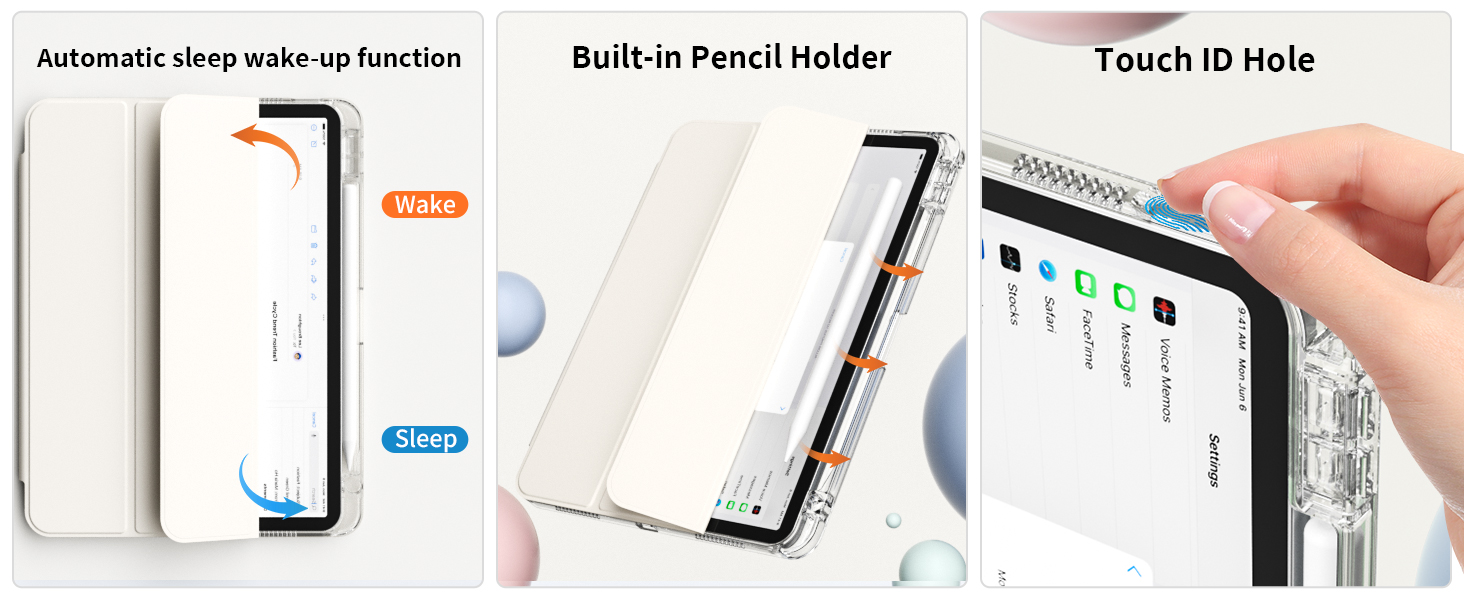 تنبيه/غفو تلقائي وفتحات دقيقة: الجراب مزود بشريط مغناطيسي يدعم ميزة النوم/الاستيقاظ التلقائي، مما يضع جهاز iPad الخاص بك في وضع النوم أو إيقاظه عند إغلاقه أو فتحه، مما يطيل عمر البطارية ويحمي جهاز iPad الخاص بك. بالإضافة إلى ذلك، تضمن الفتحات الدقيقة سهولة الوصول إلى جميع المنافذ وأجهزة الاستشعار ومكبرات الصوت والكاميرات ومعرف اللمس.