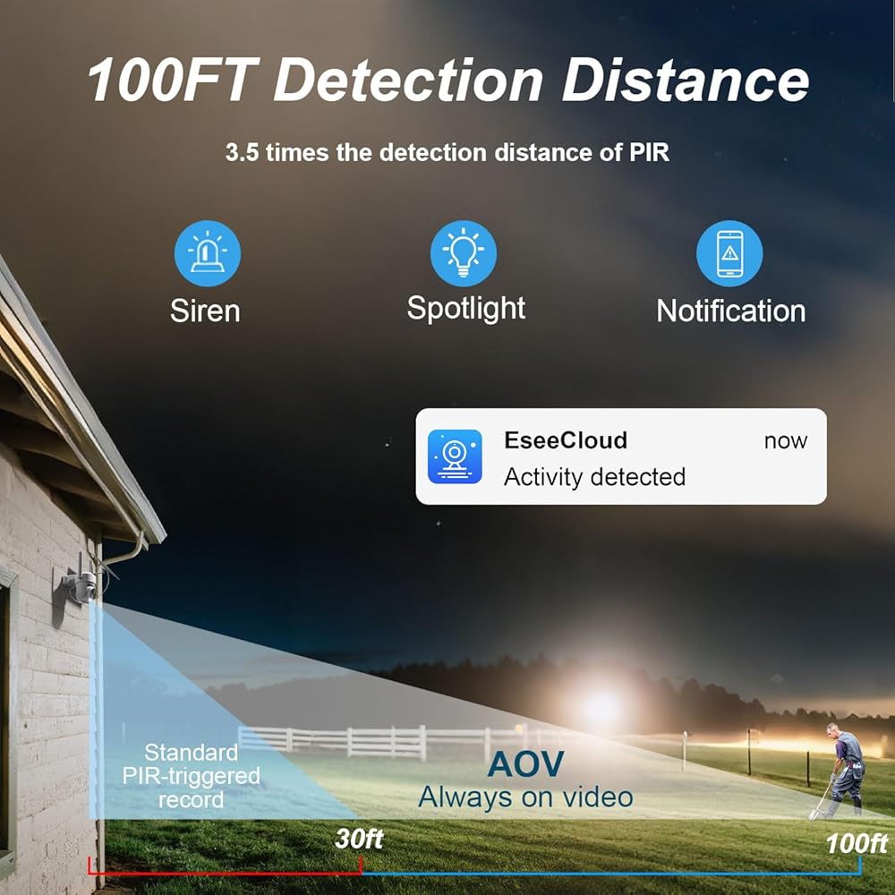 • إشعار الهاتف وإنذار صفارة الإنذار: عند اكتشاف الحركة، يمكن لكاميرا الأمان التي لا تحتاج إلى واي فاي تشغيل الأضواء وصفارة الإنذار الصوتية وبدء التسجيل وإرسال تنبيهات فورية إلى هاتفك عبر تطبيق Eseecloud لإيقاف التهديدات مبكرًا.