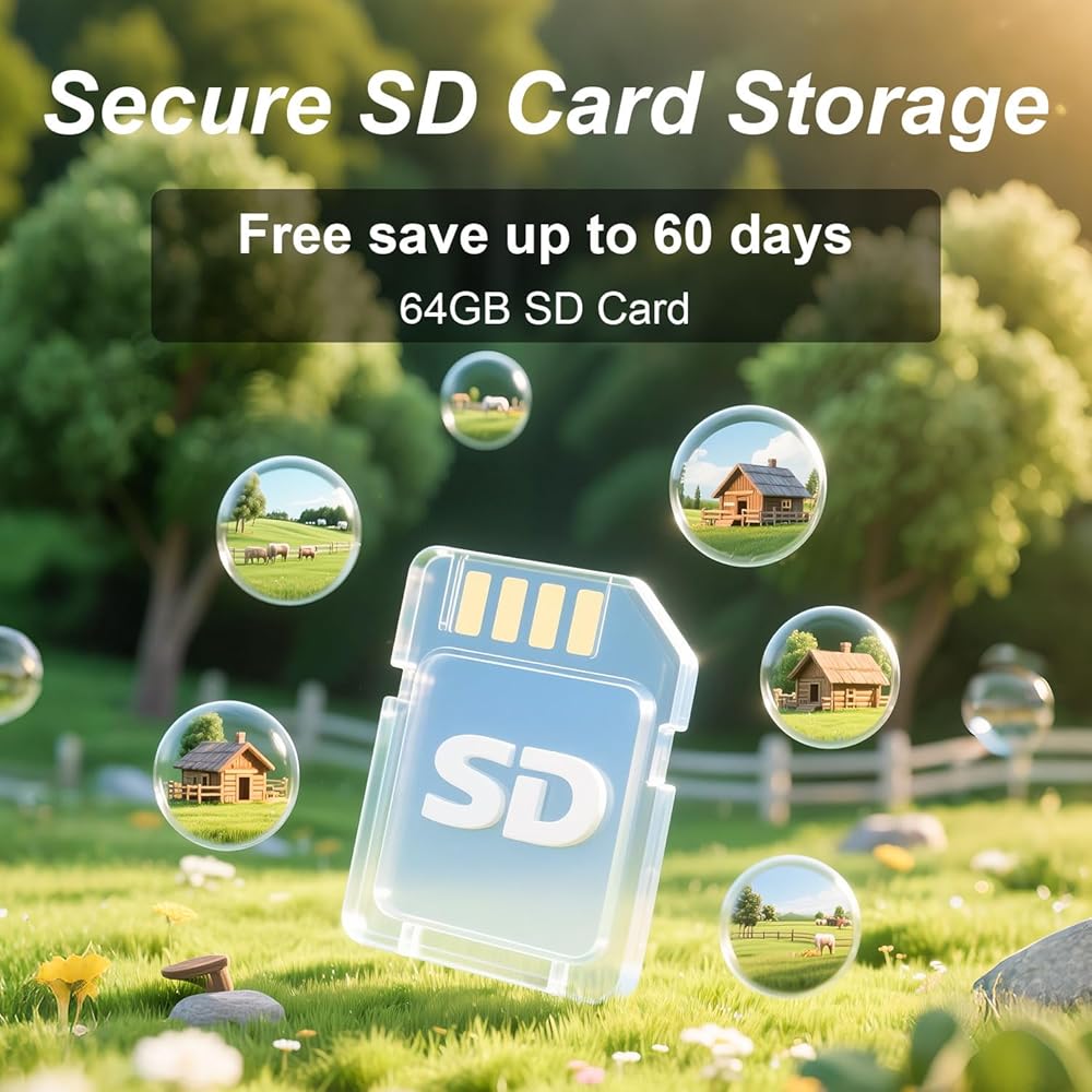 • تخزين بطاقة SD، تغطية آمنة: كاميرات الأمان اللاسلكية في الهواء الطلق بدون اشتراك تأتي مع بطاقة Micro SD بسعة 64 جيجابايت مع مساحة تخزين مجانية تصل إلى 60 يومًا، مما يسمح بالمشاهدة عن بعد والتشغيل على الهاتف في أي وقت وفي أي مكان.