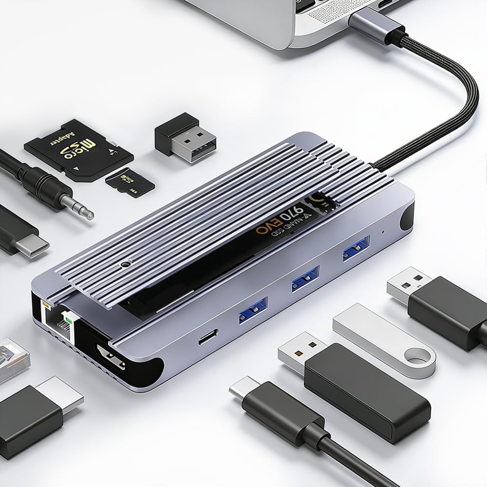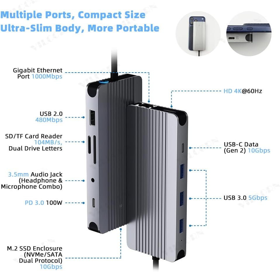 12-in-1 M.2 SSD Enclosure Docking Station USB C HUB TYPE C to HDMI Adapter 4K60Hz 1000Mbps PD100W USB3.0 5Gbps For Macbook Pro