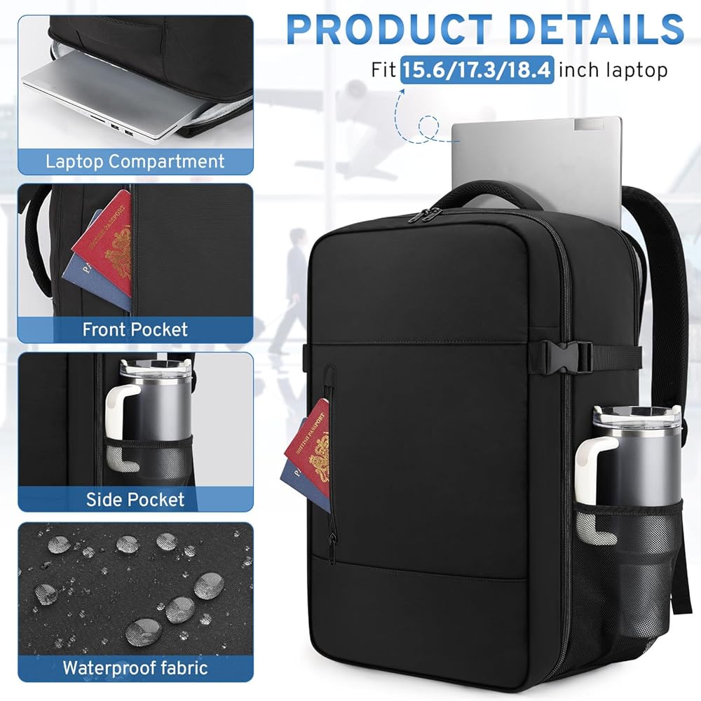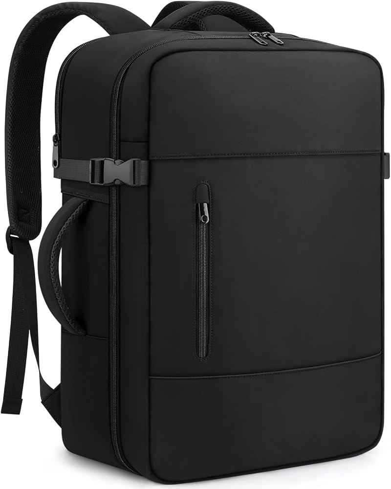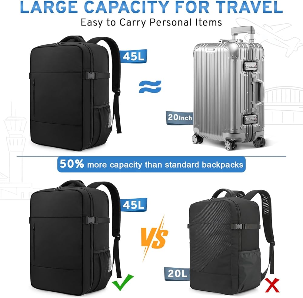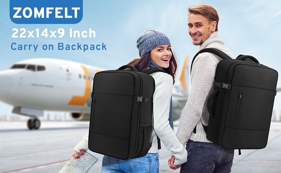 ZOMFELT حقيبة ظهر للسفر للنساء والرجال، حقيبة ظهر سعة 45 لترًا مقاس 22 × 14 × 9 معتمدة من شركة الطيران، حقيبة ظهر للكمبيوتر المحمول مقاس 15.6 بوصة من إدارة أمن المواصلات الأمريكية، حقيبة سفر للأغراض الشخصية، مقاومة للماء للعمل التجاري، أسود