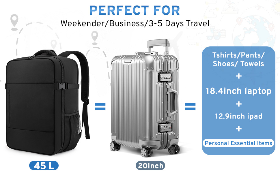 • حقيبة ظهر للسفر بسعة كبيرة جدًا 45 لتر: الأبعاد 22 × 14 × 9 بوصة، خفيفة الوزن بوزن 0.85 كجم (1.87 رطل). تتميز حقيبة السفر الواسعة بسعة 45 لترًا بقماش مقاوم للماء وحجرة رئيسية كبيرة وجيوب متعددة للتخزين المنظم. إنها تحمل بشكل مريح أساسيات السفر الشخصية للرحلات لمدة 3-7 أيام