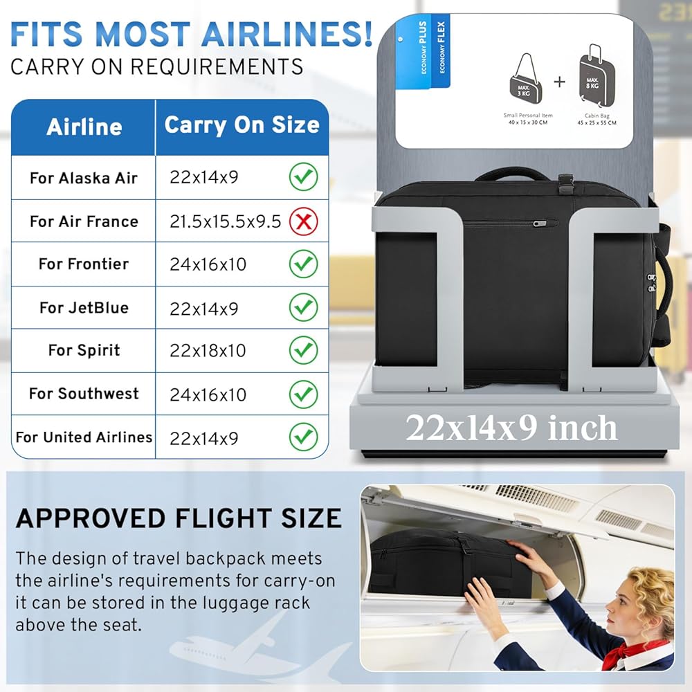 • حقيبة ظهر محمولة معتمدة من شركة الطيران: تصميم بسحاب كبير مفتوح 180 درجة للحصول على تصريح أمني سريع. حقيبة السفر الأساسية هذه المعتمدة من شركة الطيران تناسب بسهولة الصناديق العلوية. تلبي هذه الأمتعة المحمولة متطلبات الأمتعة المحمولة للعديد من شركات الطيران بما في ذلك طيران ألاسكا، وخطوط سبيريت الجوية، وجيت بلو، وساوث ويست، وفرونتير إيرلاينز، ويونايتد إيرلاينز.
