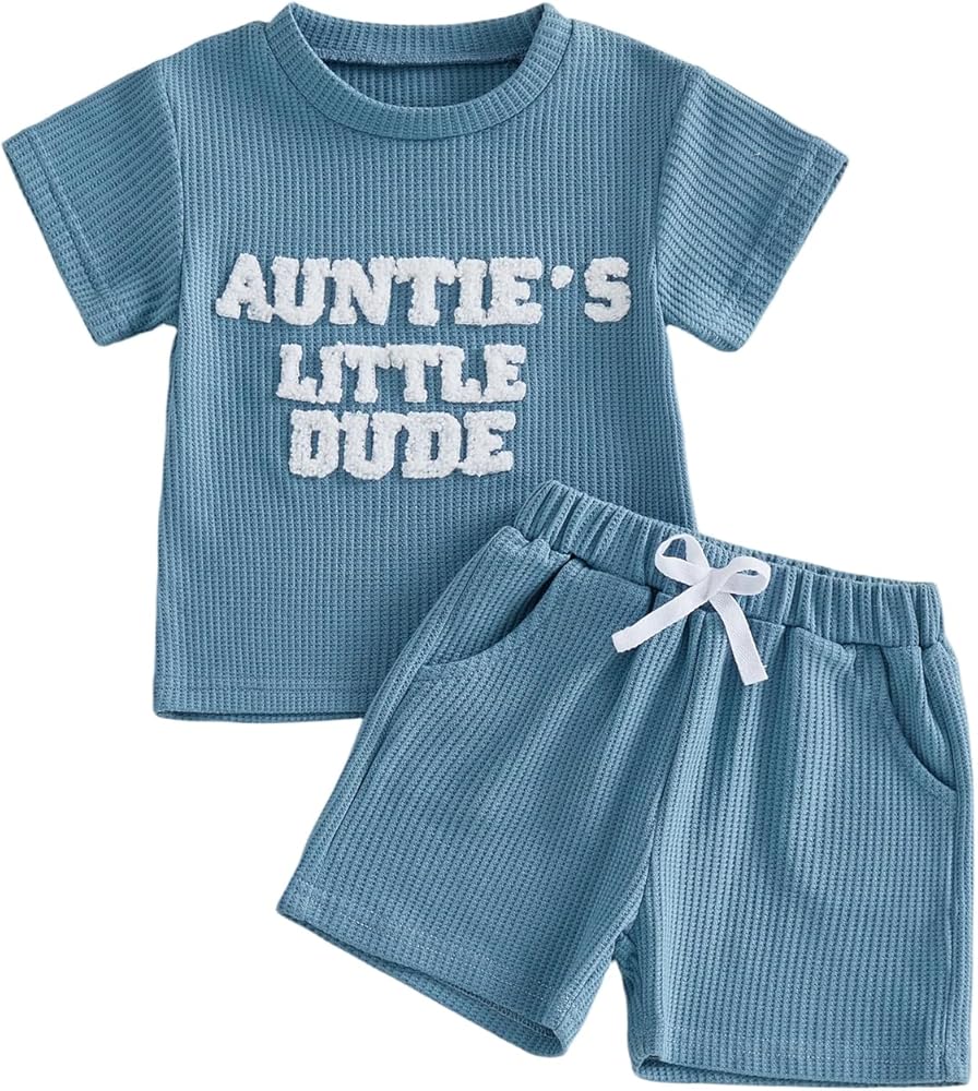 Aunties Little Dude Baby Outfit Toddler Boy Short Sleeve T Shirts and Waffle Shorts Set 2Pcs Infant Summer Clothes