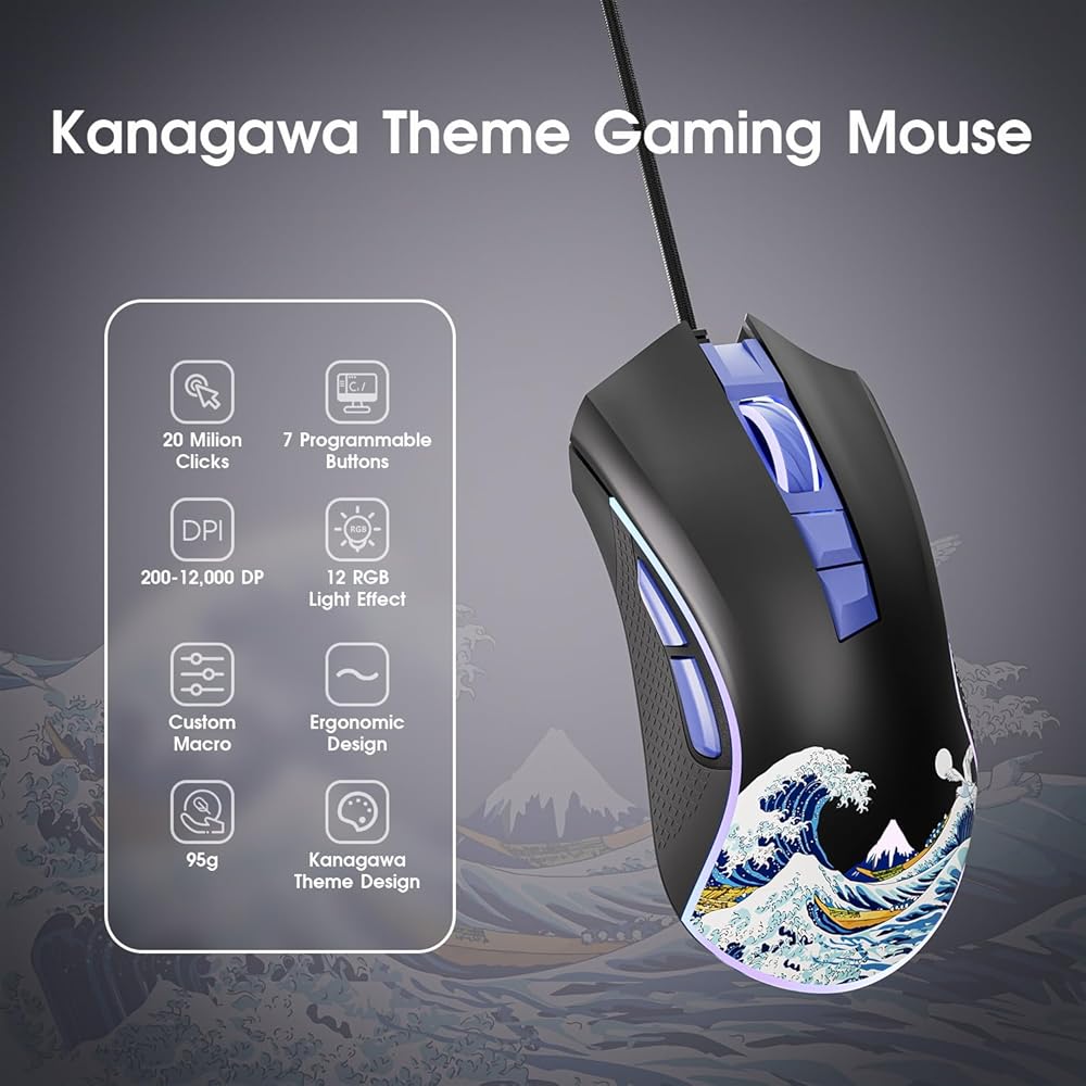 XVX PBT Keycaps 132 Keys, Great Wave Off Kanagawa Japanese Keyboard Keycaps + Wired Gaming Mouse