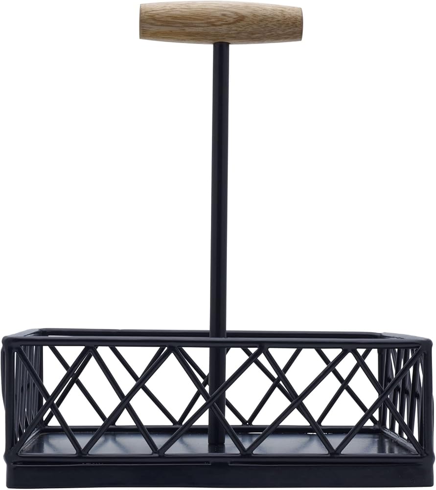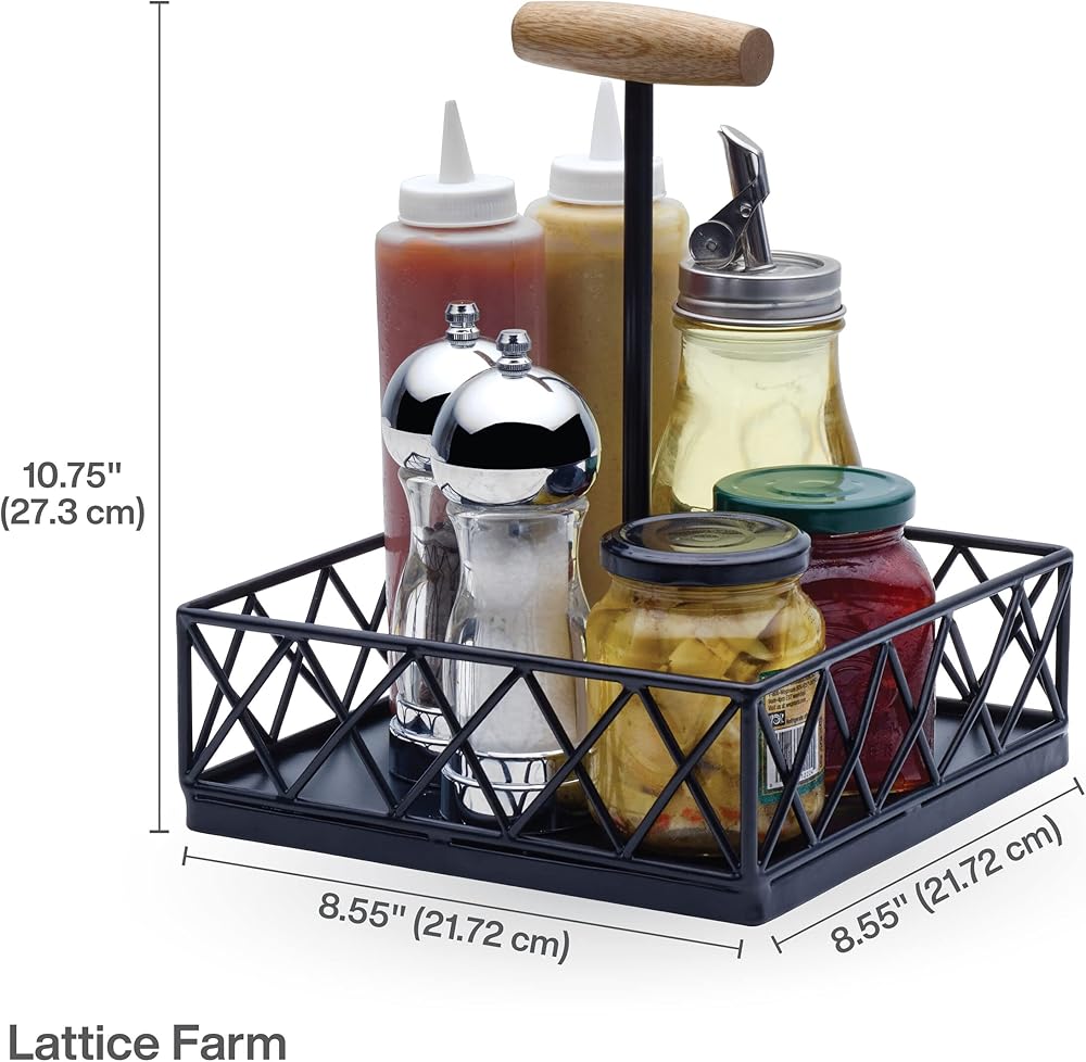 قم بتقديم التوابل والتوابل والضمادات بأناقة مع علبة بهارات المزرعة الشبكية من ميكاسا جورميت بيزكس. يمنع الجدار ذو الإطار السلكي العناصر من السقوط، بينما يسمح المقبض المدمج بسهولة النقل. مصنوعة من الحديد وخشب المانجو لجمال يدوم طويلاً. تفاصيل السلك الأسود والمنصة المصنوعة من الخشب الطبيعي تكمل أي إعداد طاولة مع إضافة مظهر مذهل لمطبخك. ببساطة امسحها بقطعة قماش ناعمة ورطبة. مقاس 8.5 × 8.5 × 10.75 بوصة. .