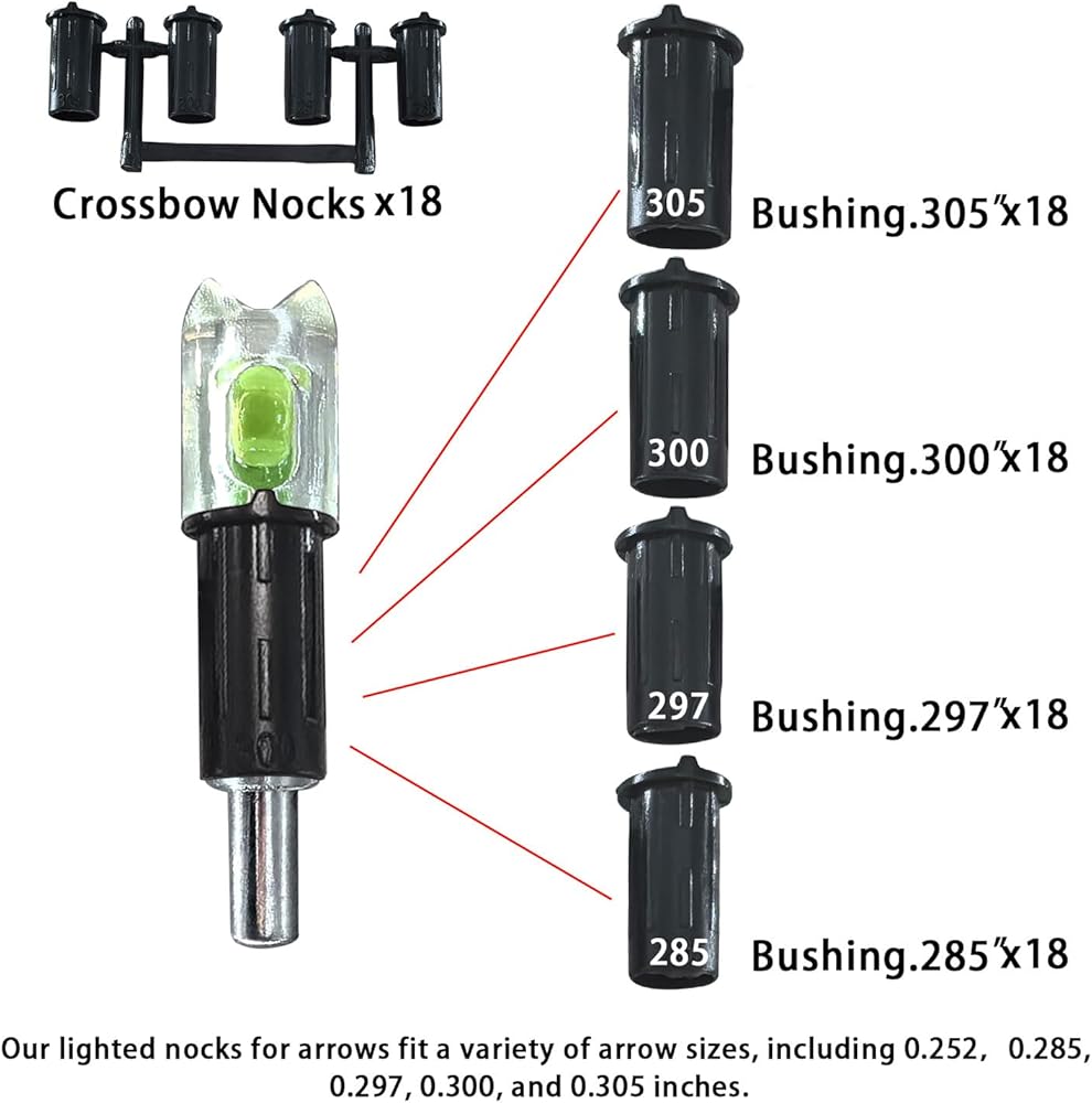【Versatile Compatibility】: Our lighted nocks for arrows are expertly crafted to accommodate the most common carbon bolts, 18PCS Lighted Nocks Universal Fit for Crossbow Bolts with .252”/.285”/.297”/.300”/.305” Bushings, making them ideal lighted nocks for crossbows and bow hunting accessories.