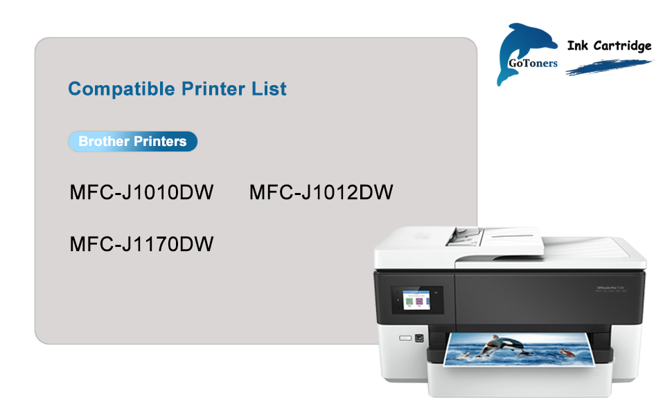 متوافق مع سلسلة طابعات Brother MFC-J1010DW، MFC-J1012DW، MFC-J1170DW، MFC-J1800DW. يرجى الاستمتاع بالتعرف السريع والموثوق على الخرطوشة وعرض دقيق لمستوى الحبر وتجربة طباعة فعالة وخالية من المتاعب