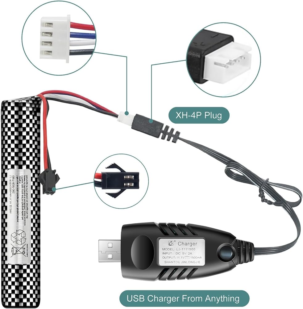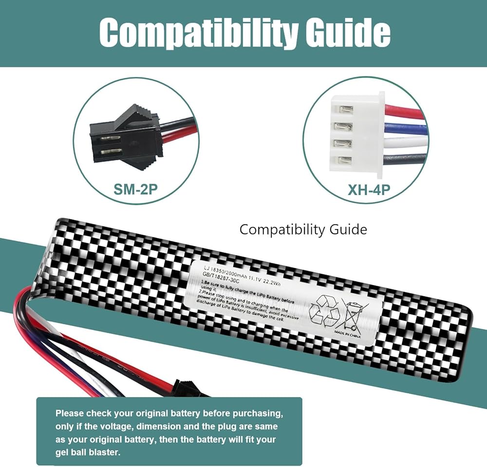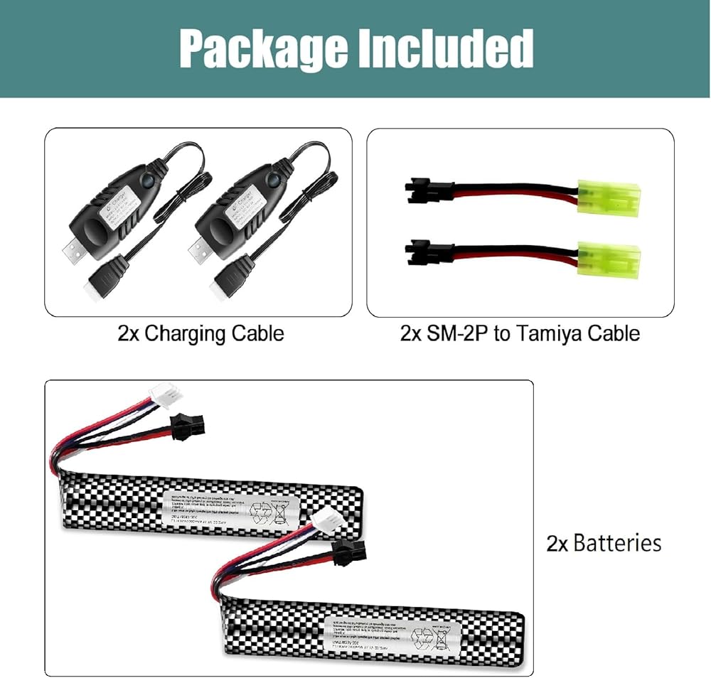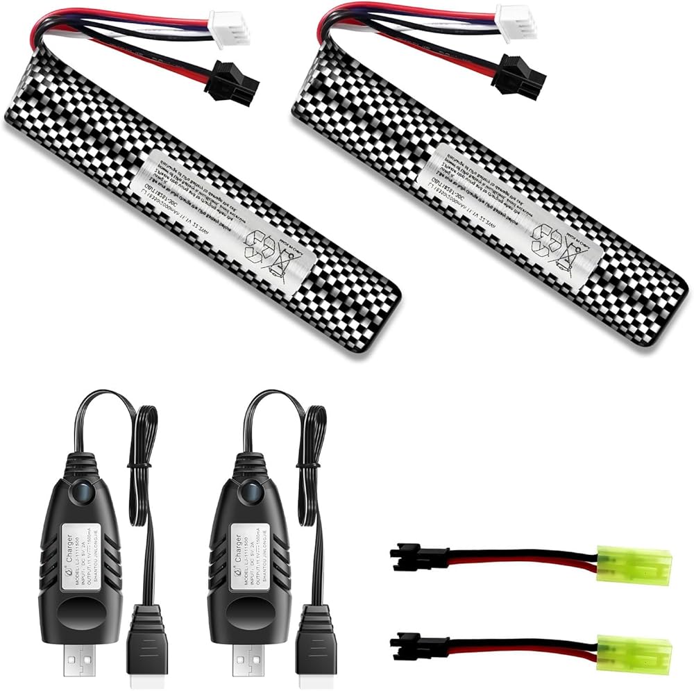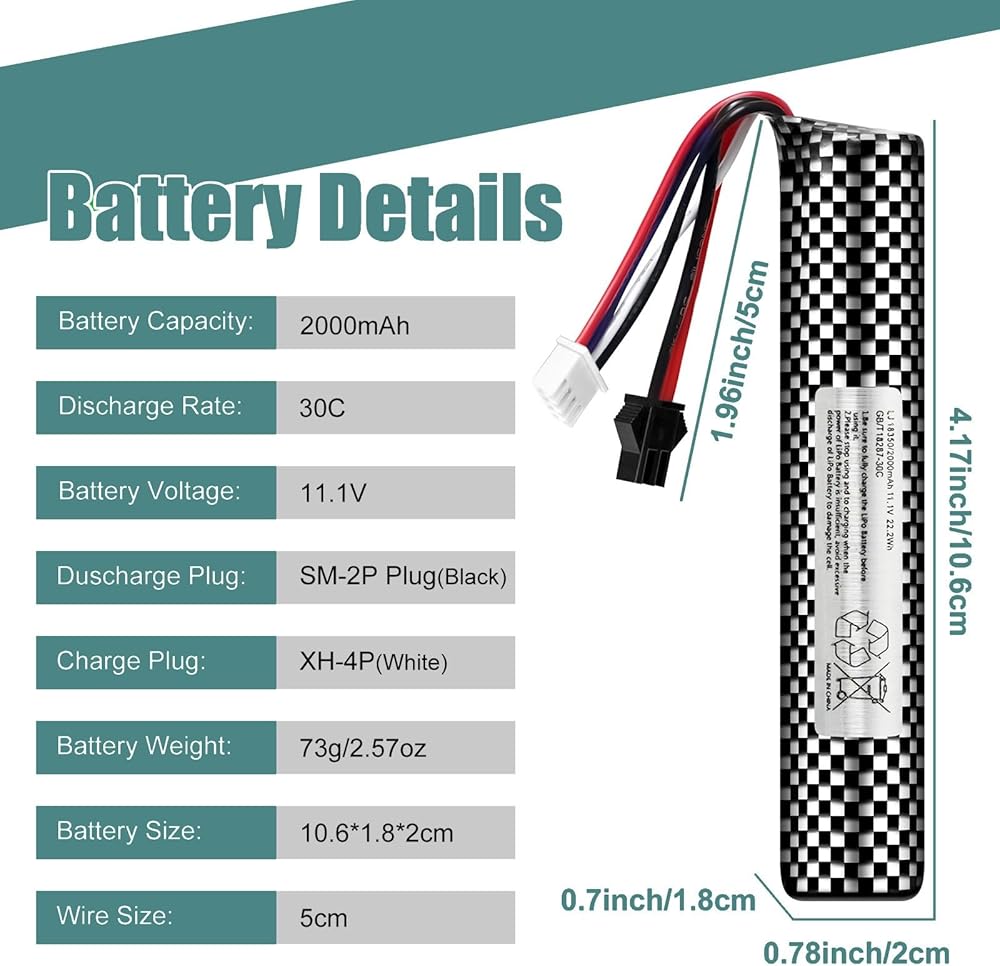 بطارية Airsoft 11.1 فولت 2000 مللي أمبير في الساعة SM2P مع شاحن USB لجهاز Airsoft Gel Water Bead Blaster، بطاريات قابلة لإعادة الشحن، جهاز التحكم عن بعد والتطبيق، بطاريات المركبات (عبوتان)