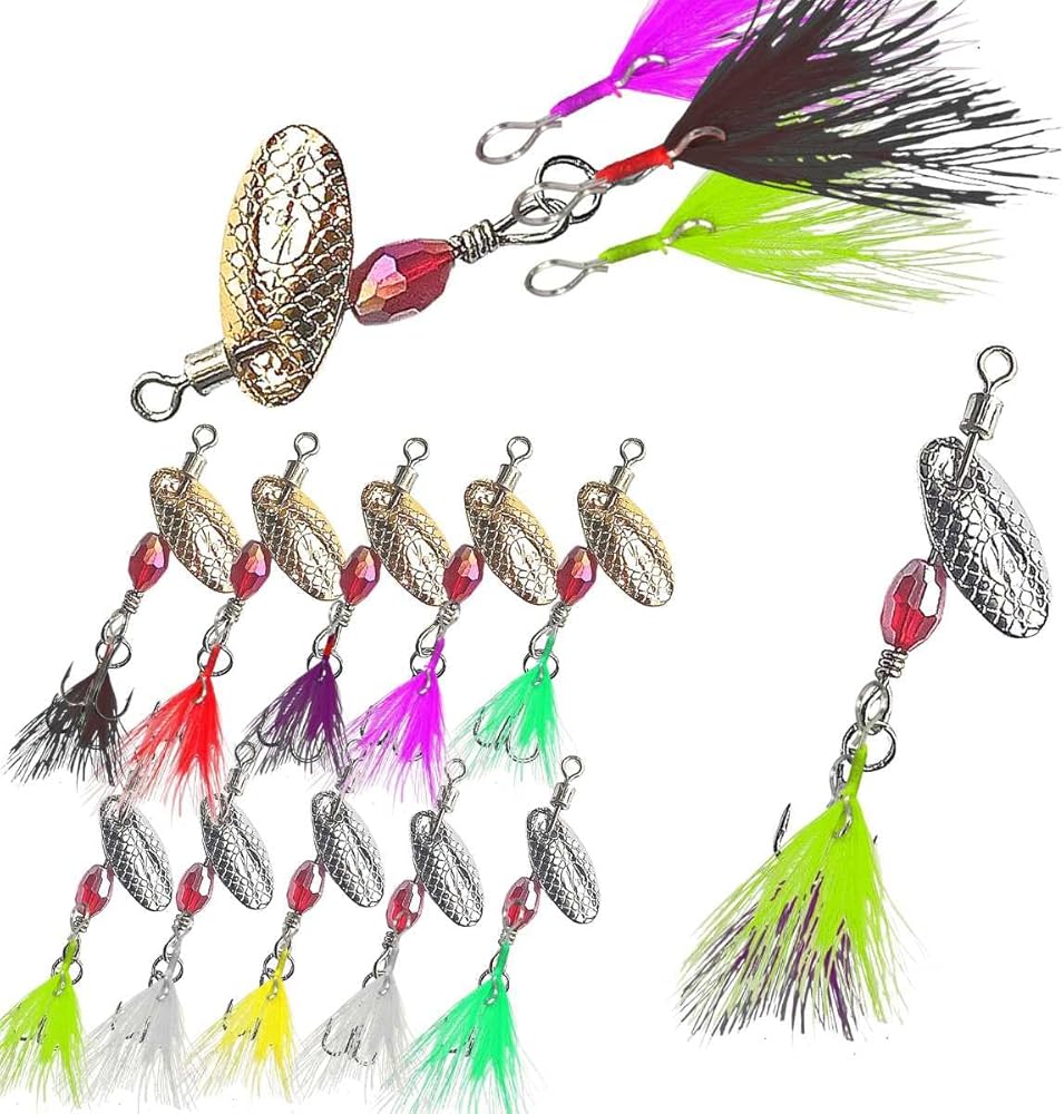 Versatile Rooster Tail Fishing Lures Spinner Baits Kit: Includes 10 pcs 1/4 oz (7g) fishing spinners in a range of vibrant colors, plus 16 interchangeable feather tails in 8 colors - black, white, chartreuse, red, yellow, pink, green, and purple. Create your perfect combo for every fishing condition on the fly