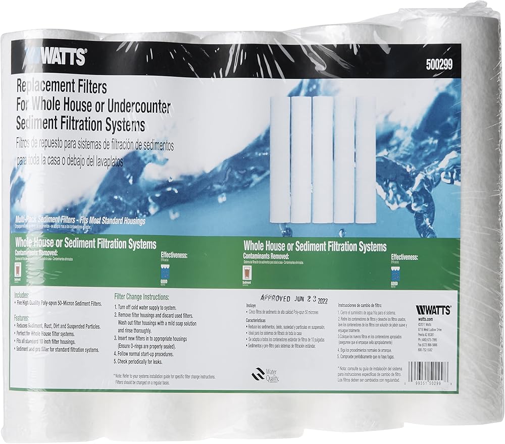 Watts WHOLE HOUSE FP Premier Replacement Filters will reduce sediment, dirt, rust & suspended particles from your drinking water, improving the taste and clarity of your water. These high quality sediment filters will fit all standard 10" housings. 5-Pack of 50-micron sediment filters for Whole House and under counter water filter systems.