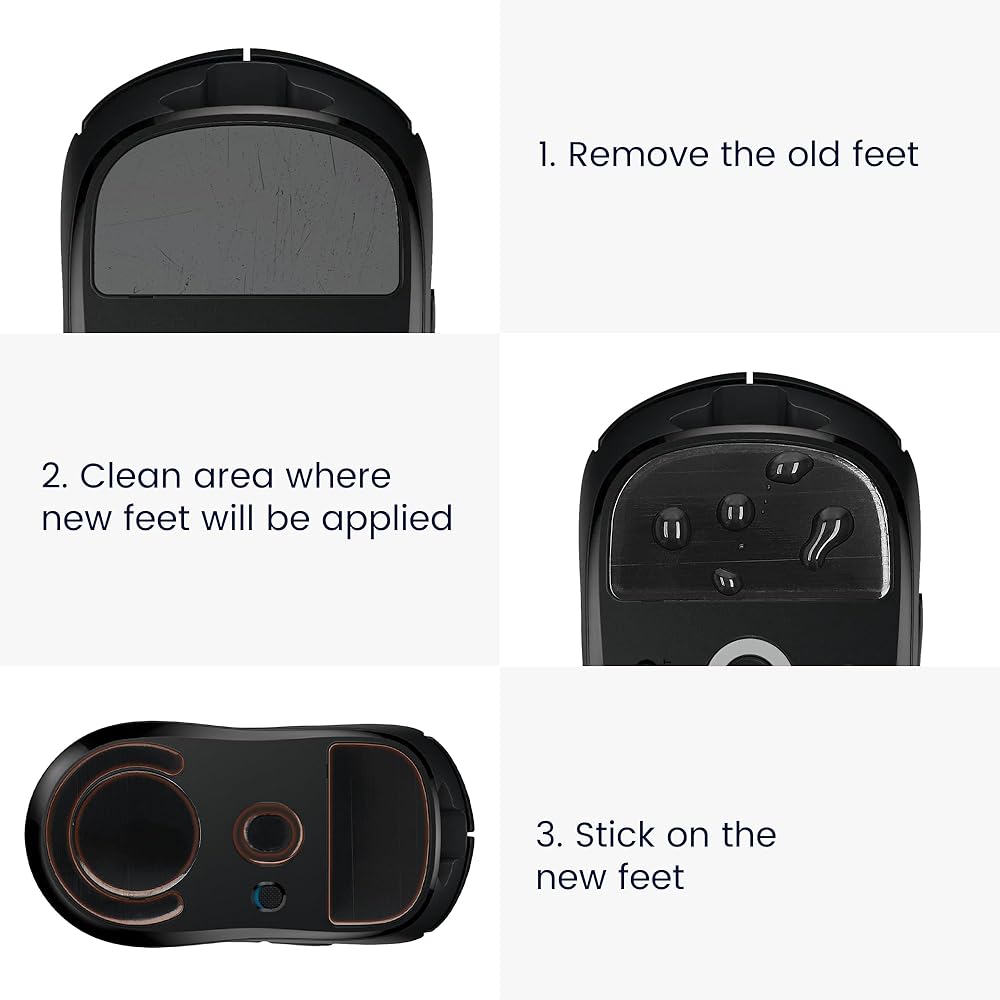 How to: Peel off the current feet, clean the area and then attach the new rubber feet to your computer mouse