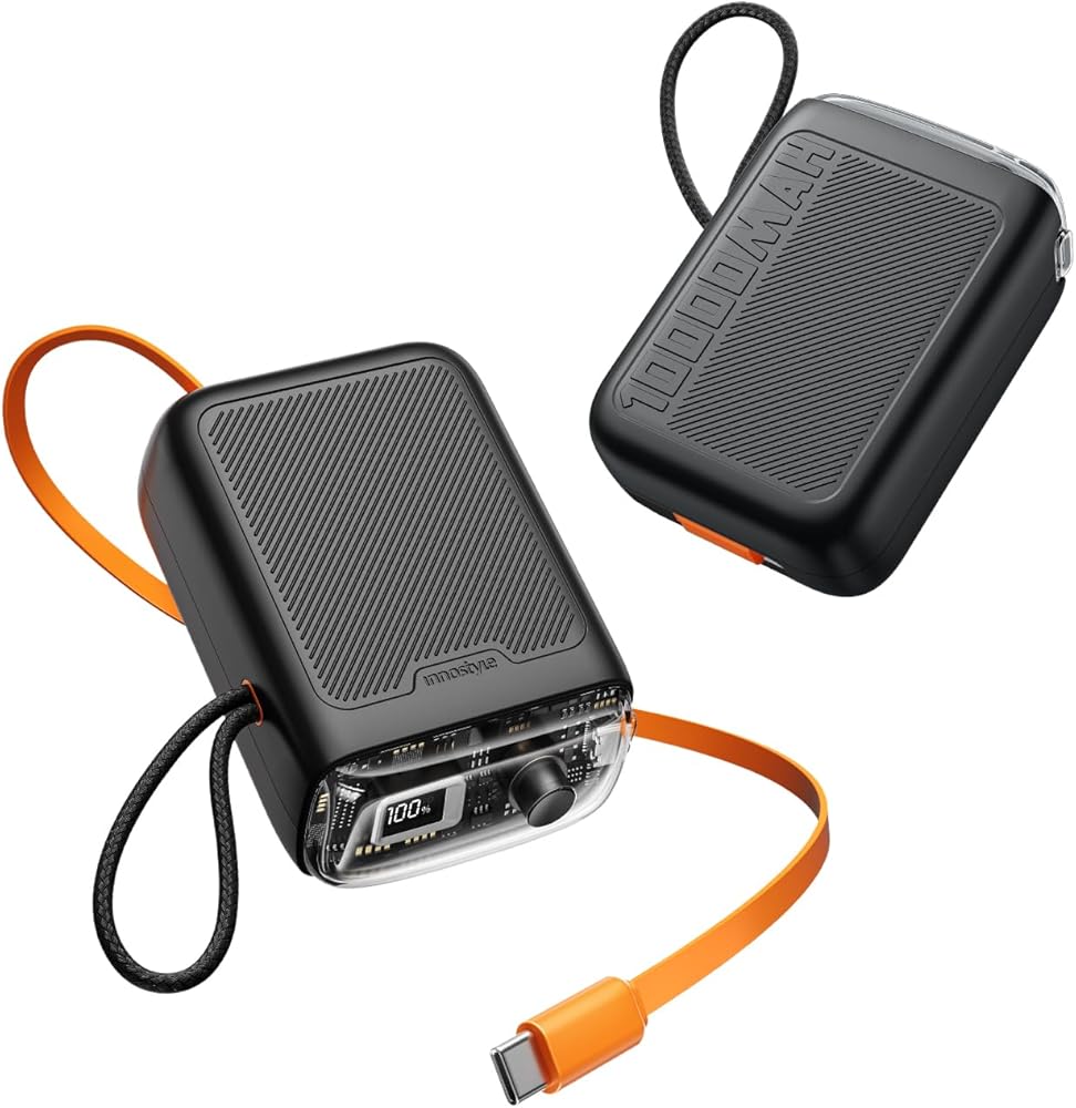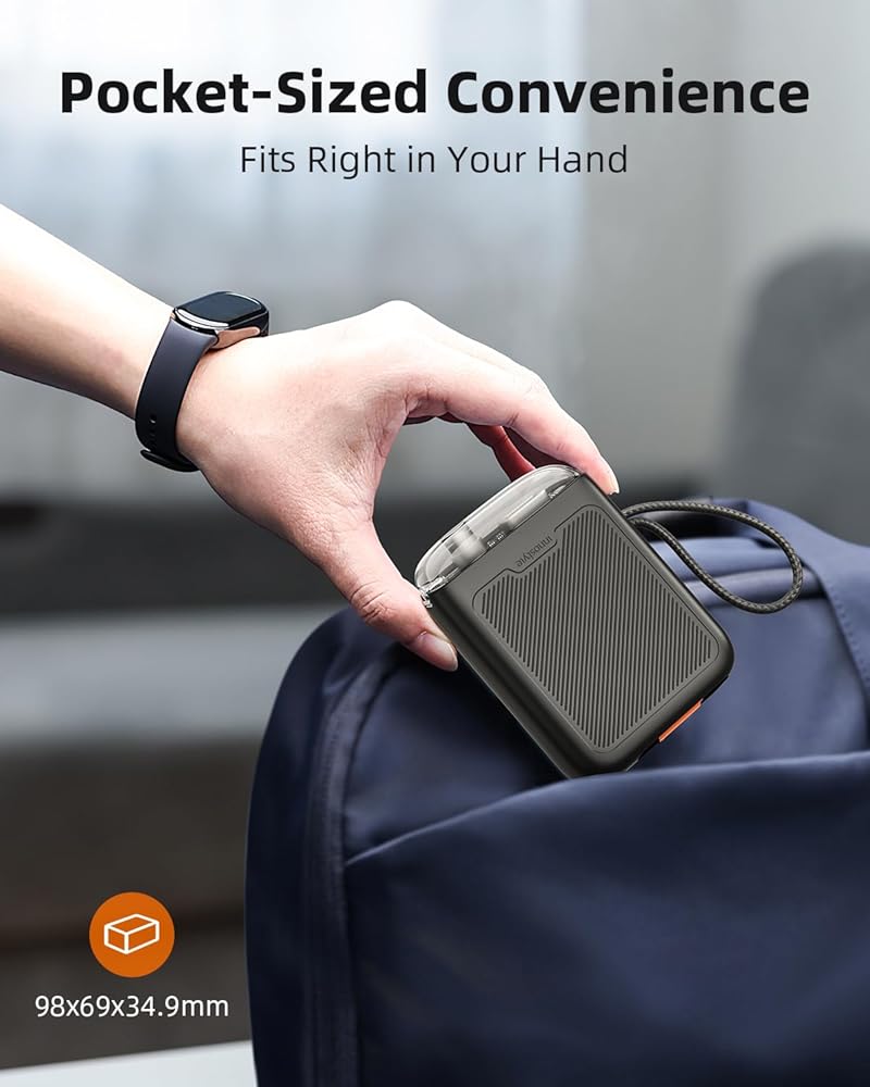 بنك طاقة للشحن ثنائي الاتجاه، كابلات مدمجة قابلة للسحب، شحن جهاز مزدوج، بنك طاقة للهاتف الأساسي للسفر، متوافق مع iPhone 17 Pro Max وSamsung وiPad (أسود)