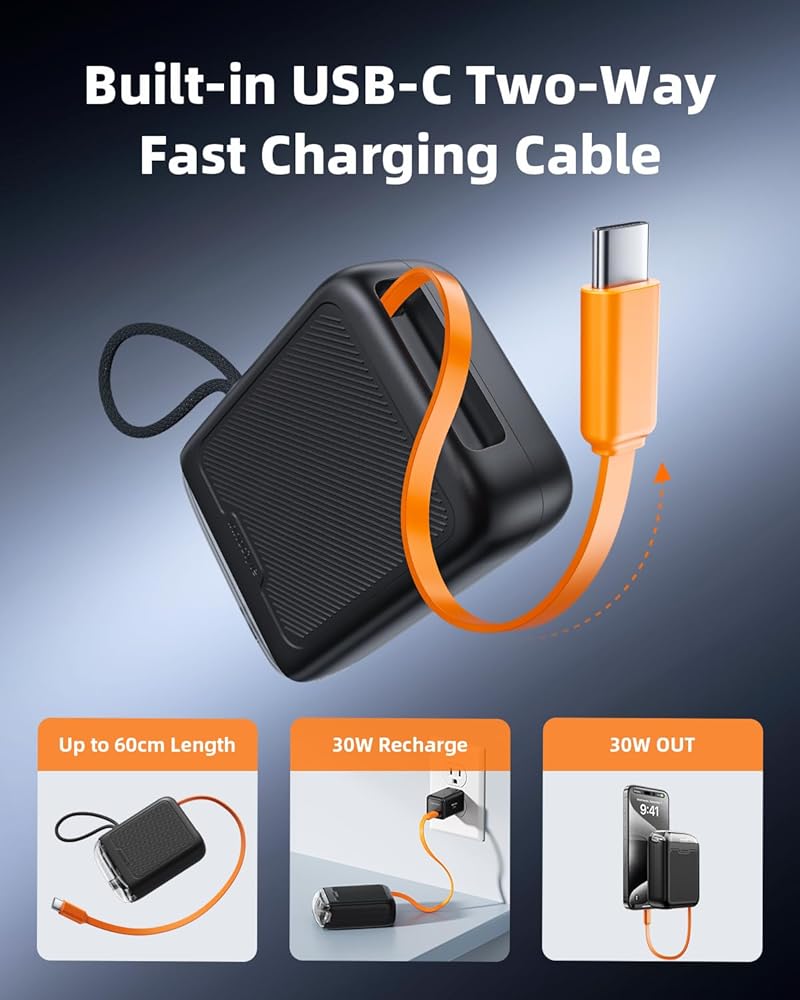 كابل USB C مدمج قابل للسحب: قل وداعًا للأسلاك المتشابكة! يتراجع كابل USB C المدمج بطول 60 سم بسلاسة، وهو بنك طاقة للشحن ثنائي الاتجاه، مما يوفر حل شحن مريحًا وخاليًا من الفوضى. لا حاجة لحمل كابل إضافي - فقط اسحب الكابل وابدأ الشحن.