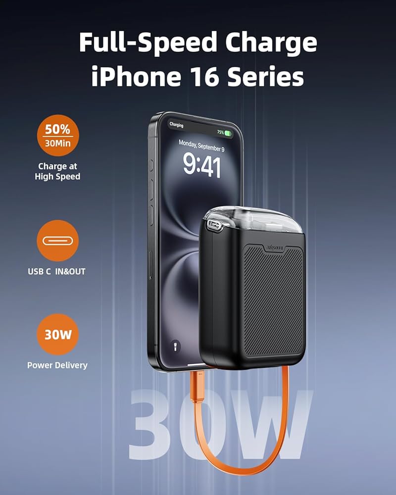 شحن سريع 30 وات: مزود بتقنية الشحن السريع 30 وات، مما يقلل وقت الشحن بشكل كبير. احصل على تعزيز سريع للطاقة لأجهزتك، حتى تتمكن من العودة إلى استخدامها في وقت قصير. اشحن هاتف iPhone 16 الخاص بك من 0 إلى 50% خلال 30 دقيقة فقط.