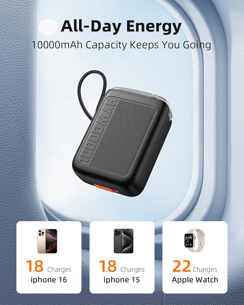 بطارية عالية السعة 10,000 مللي أمبير في الساعة: بسعة 10,000 مللي أمبير في الساعة، يمكن لبنك الطاقة هذا شحن هاتف iPhone 16 الخاص بك حتى 2.5 مرة، وSamsung Galaxy S24 حوالي 1.8 مرة، ومعظم أجهزة Android عدة مرات. حافظ على تشغيل أجهزتك طوال اليوم.