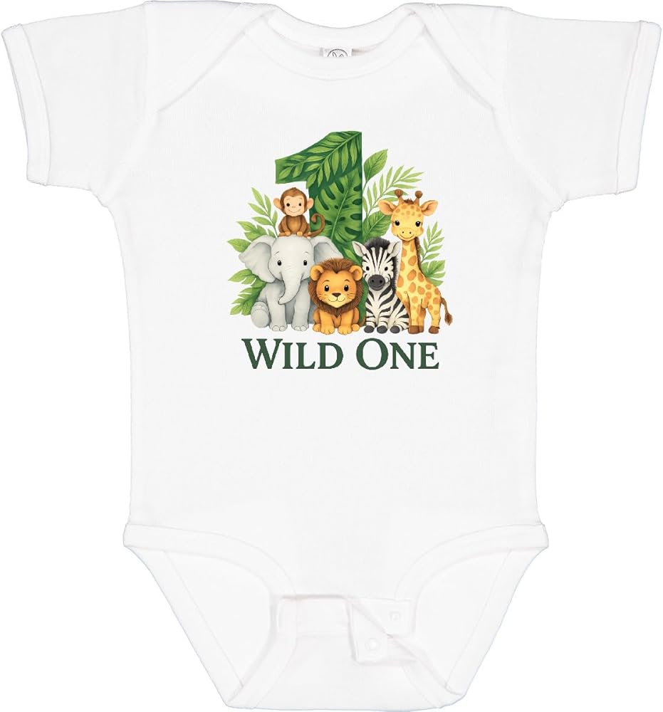 Celebrate your little one's first birthday with this adorable Wild One safari animal design. Featuring a cute monkey, elephant, lion, zebra, and giraffe, it's perfect for a fun and adventurous party. Make your child's day extra special with the Baby Bodysuit.