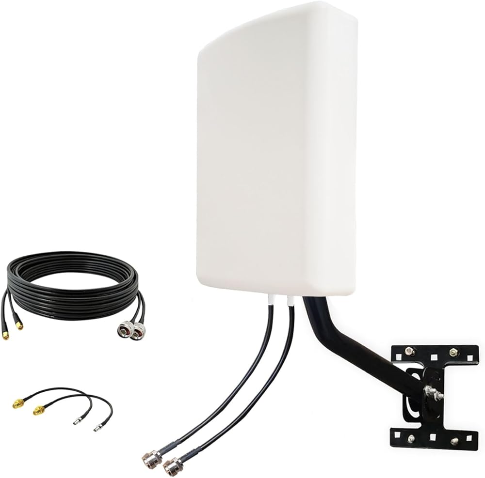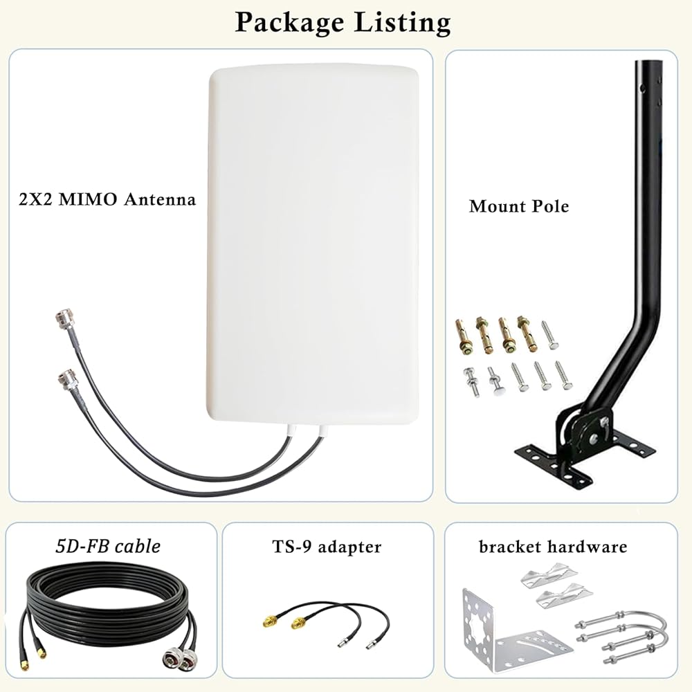 This Cellular antenna is a complete 4g lte 5g mimo antenna kit, including a pole, two 10-meter cables with SMA male connectors, and two TS-9 adapters, ensuring it can be connected to virtually any 5G modem/router or hotspot device on the market with an external antenna interface.