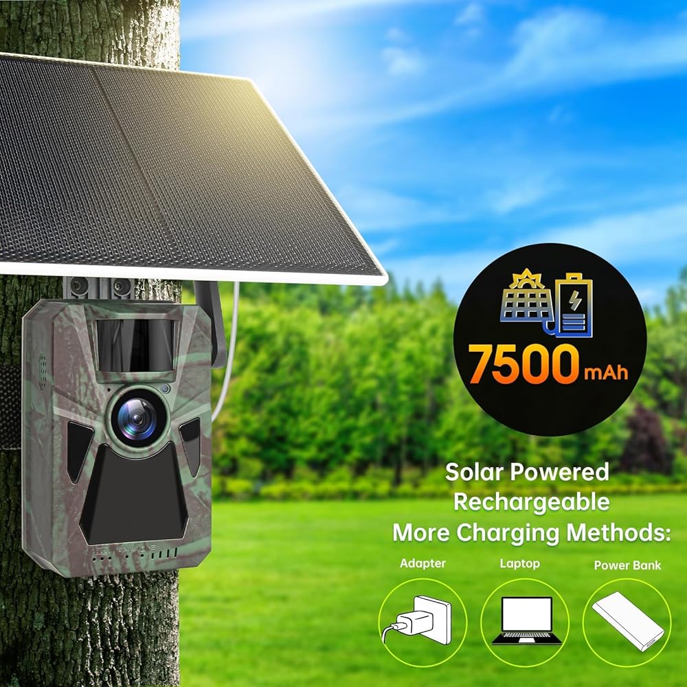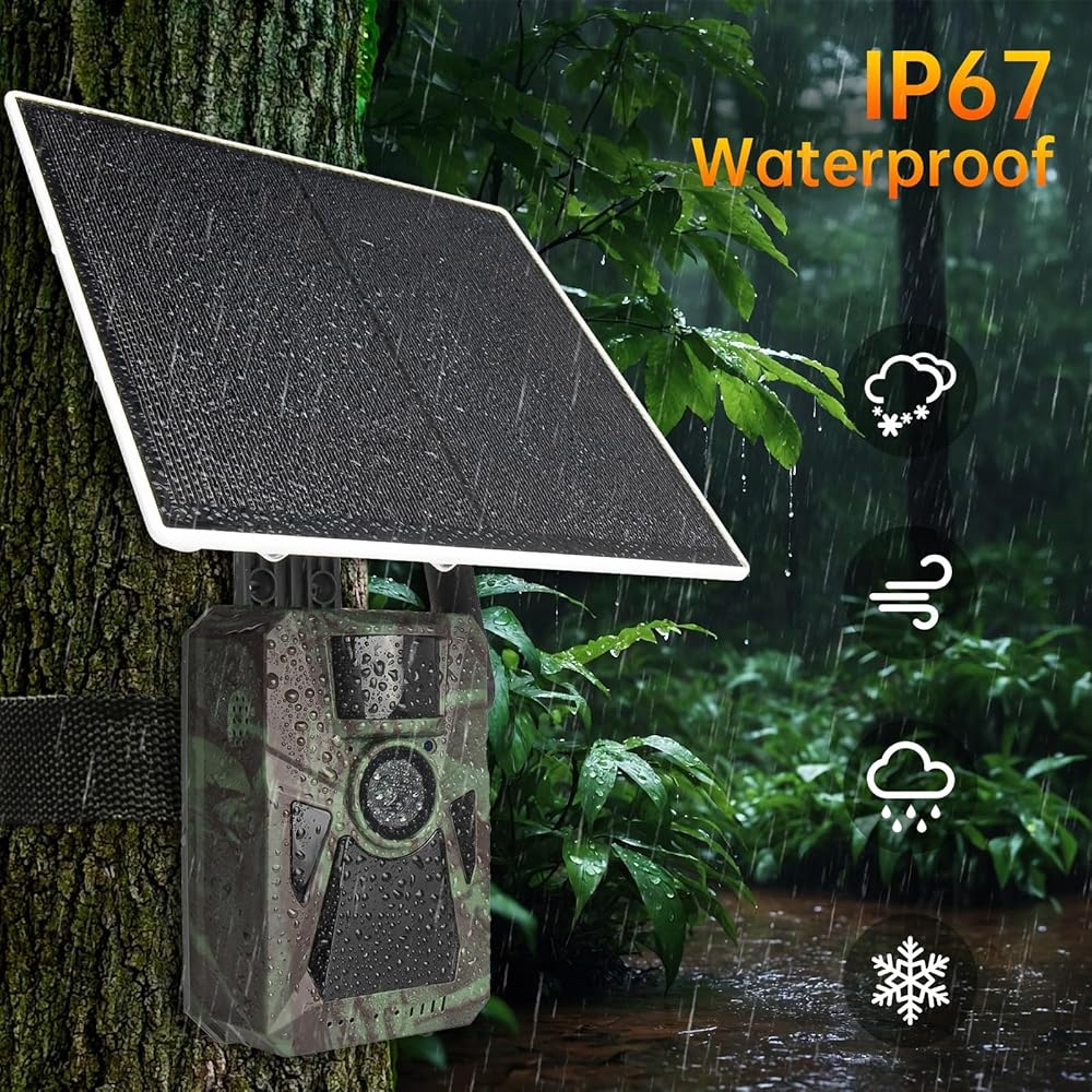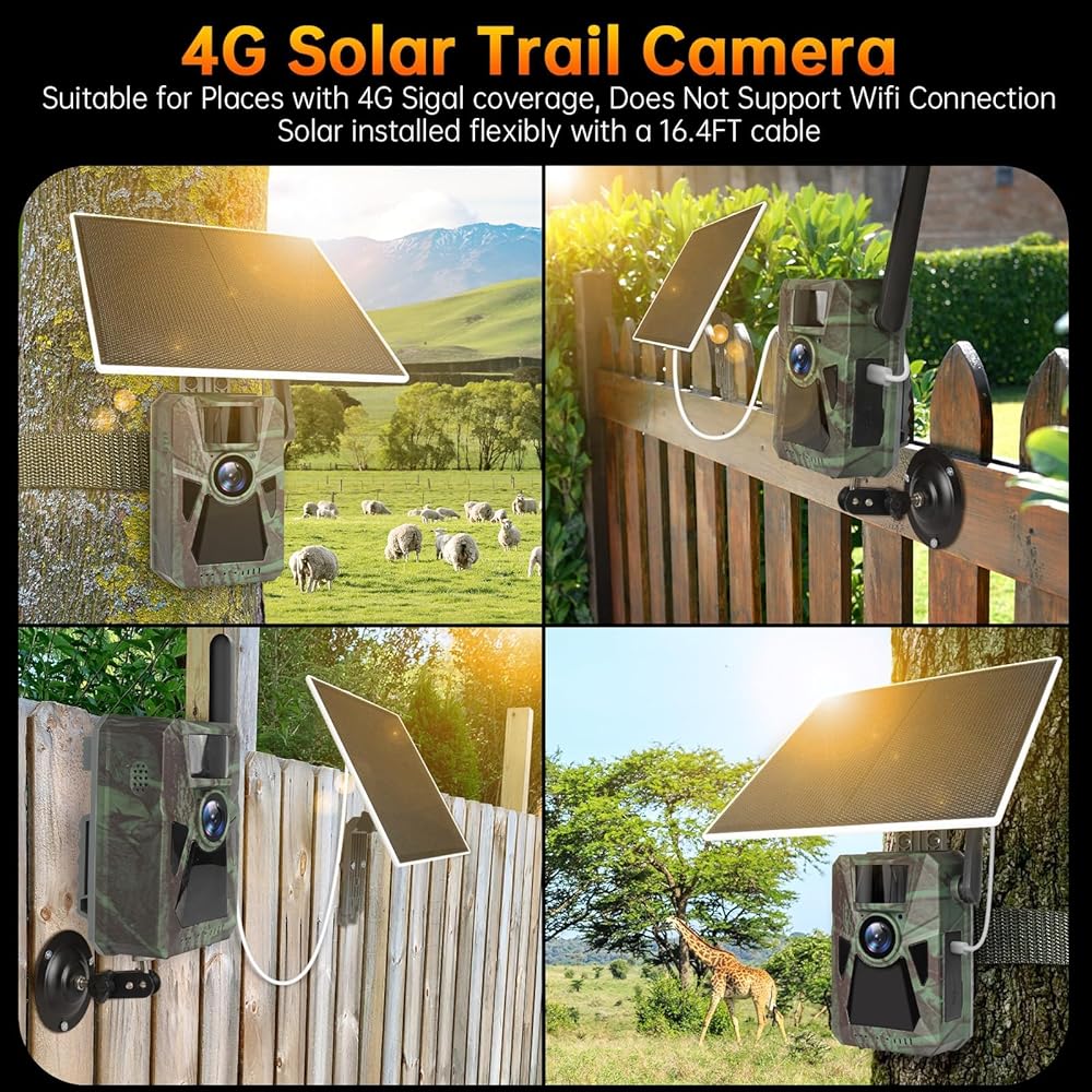 كاميرا خلوية تعمل بالطاقة الشمسية 4G - 4K 48 ميجابكسل، بطارية مدمجة 7500 مللي أمبير في الساعة، اتصال تلقائي على مستوى البلاد، رؤية ليلية، كاميرا ألعاب الصيد للحياة البرية والأمن والمراقبة