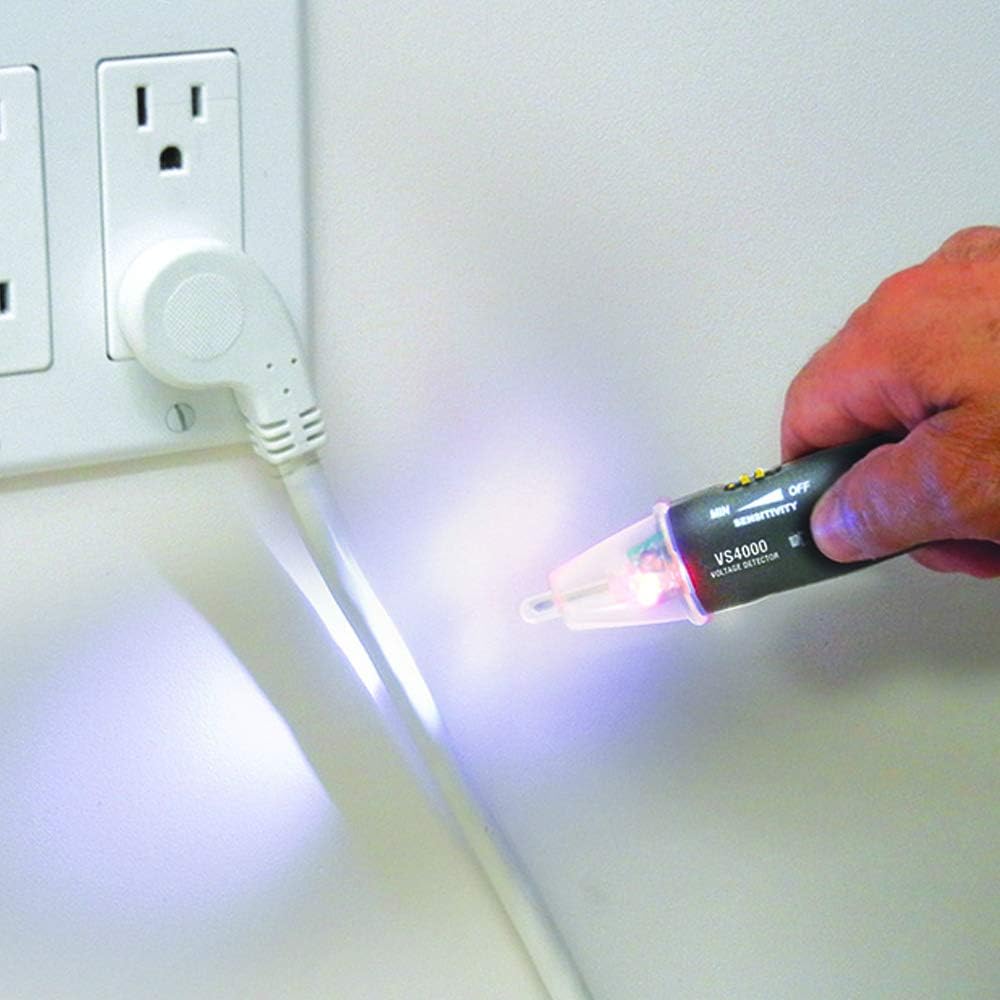 السلامة أولاً - كاشف الجهد الكهربائي بدون تلامس VS4000 - تأكد من إيقاف الطاقة قبل بدء مشروع المنزل الكهربائي القادم، ضع الكاشف بالقرب من المنفذ أو السلك.